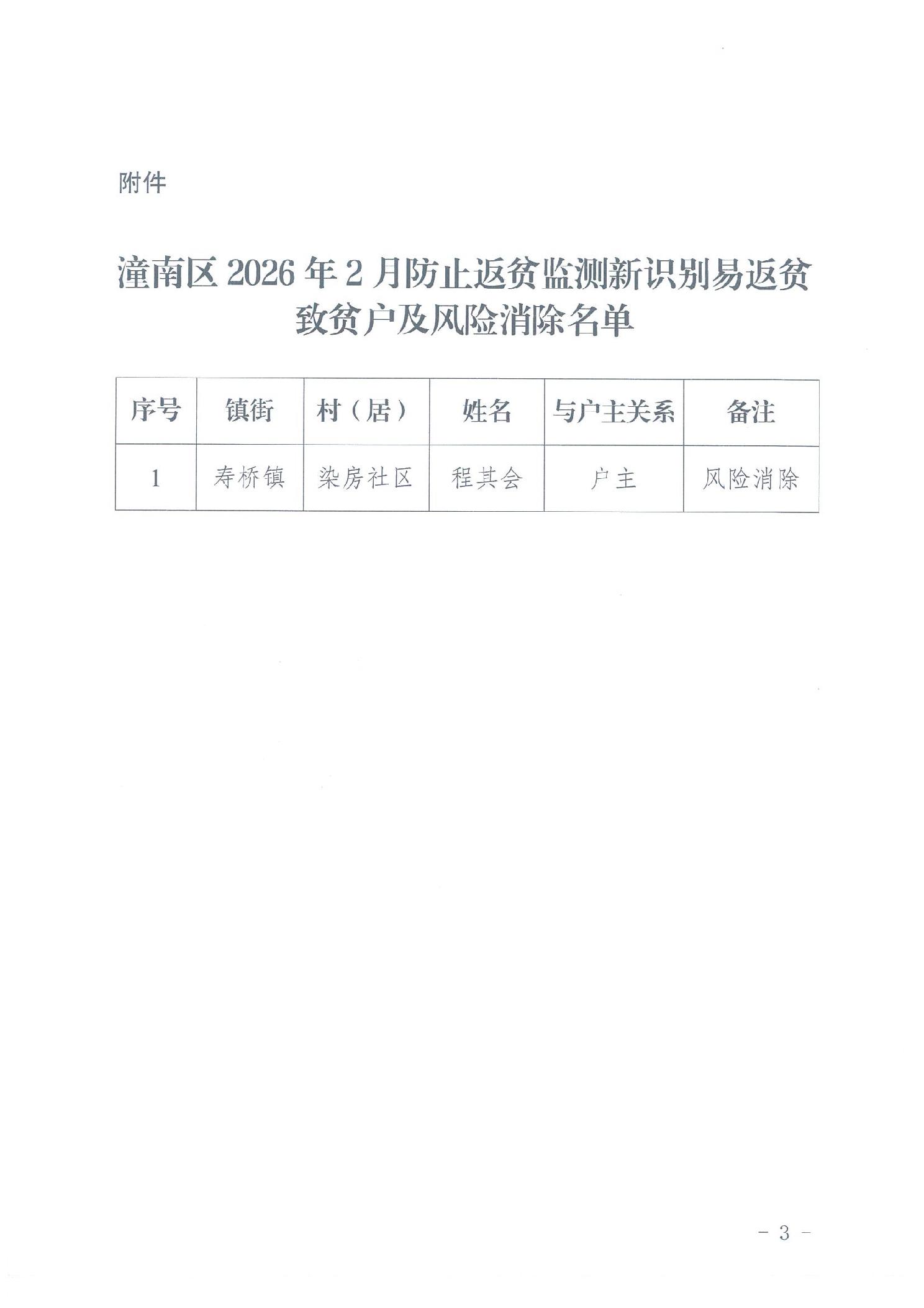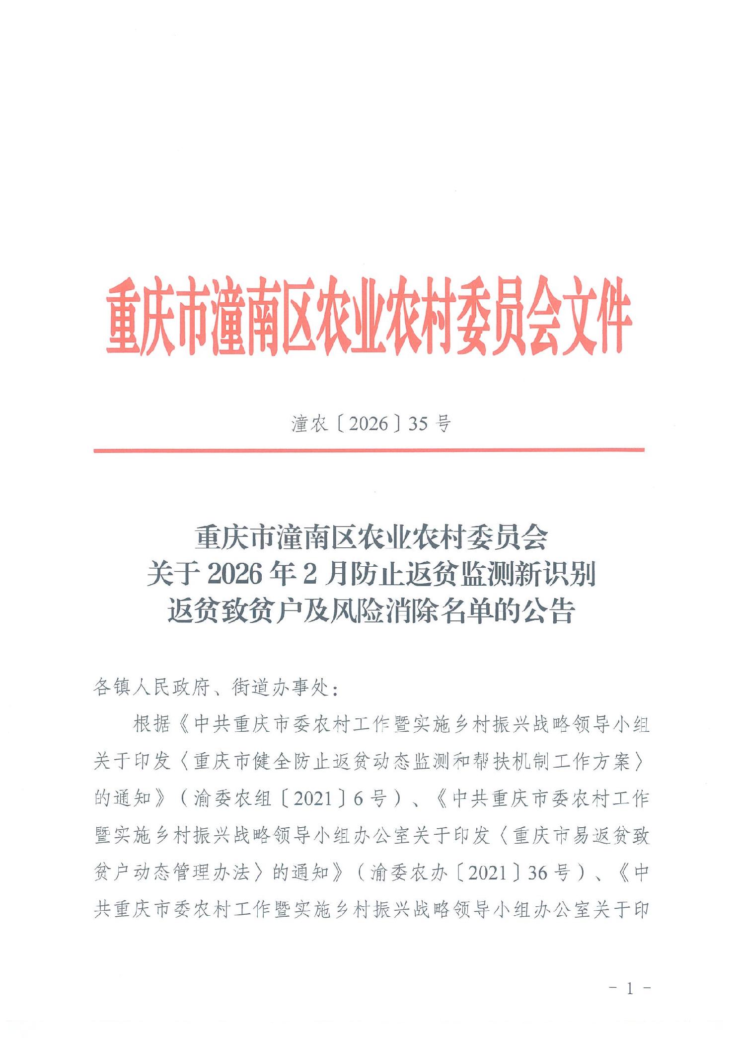 潼农〔2026〕35号 重庆市潼南区农业农村委员会关于2026年2月防止返贫监测新识别返贫致贫户及风险消除名单的公告