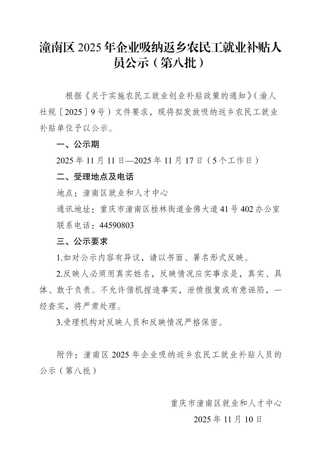 潼南区2025年企业吸纳返乡农民工就业补贴人员公示(第八批)