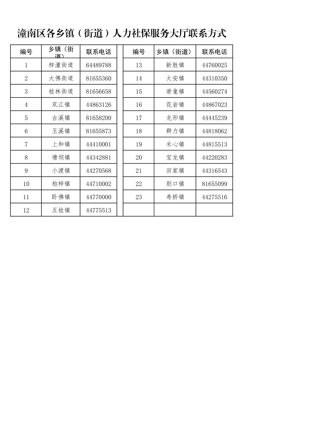 潼南区各乡镇(街道)人力社保服务大厅联系方式