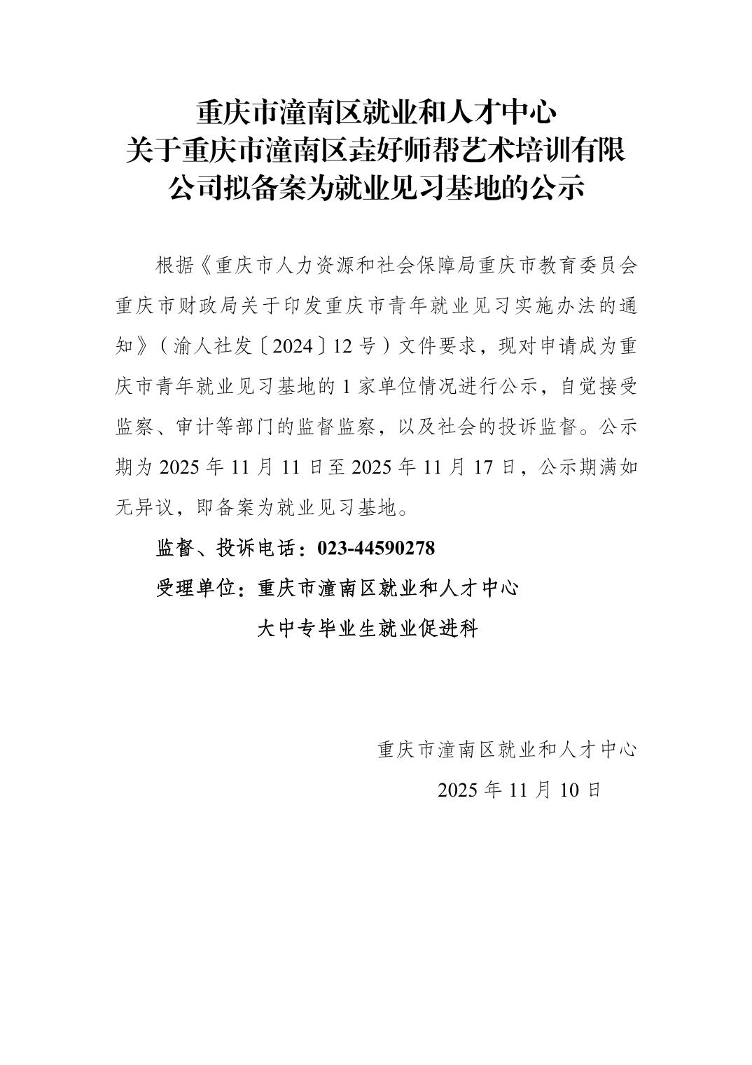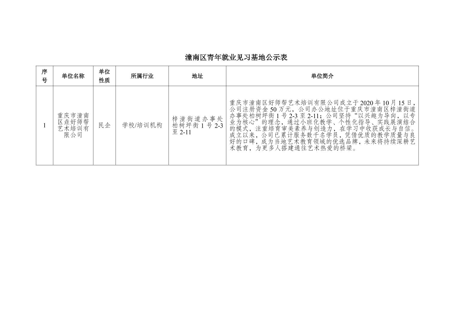 重庆市潼南区就业和人才中心关于重庆市潼南区垚好师帮艺术培训有限公司拟备案为就业见习基地的公示
