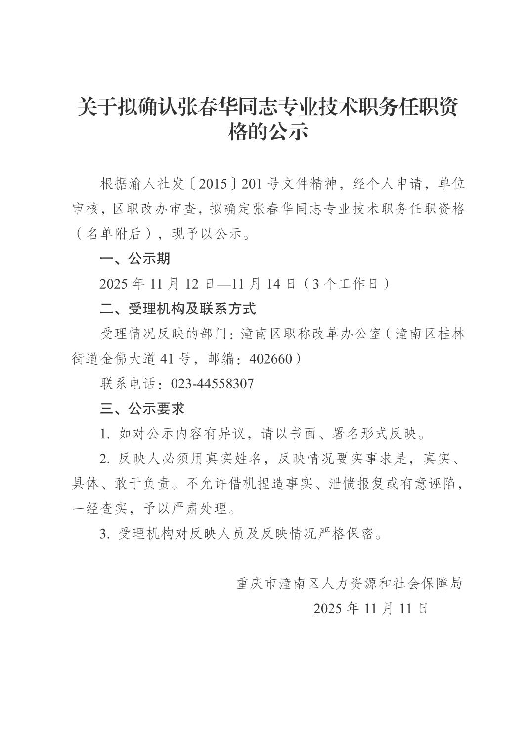 关于拟确认张春华同志专业技术职务任职资格的公示