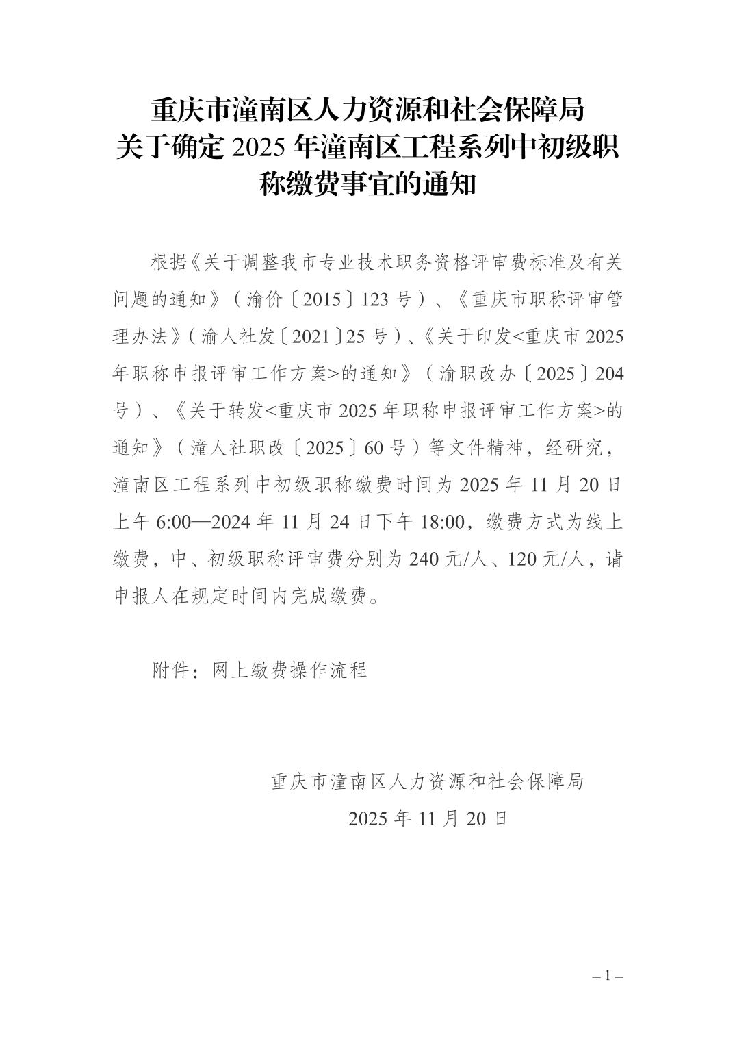 重庆市潼南区人力资源和社会保障局关于确定2025年潼南区工程系列中初级职称缴费事宜的通知