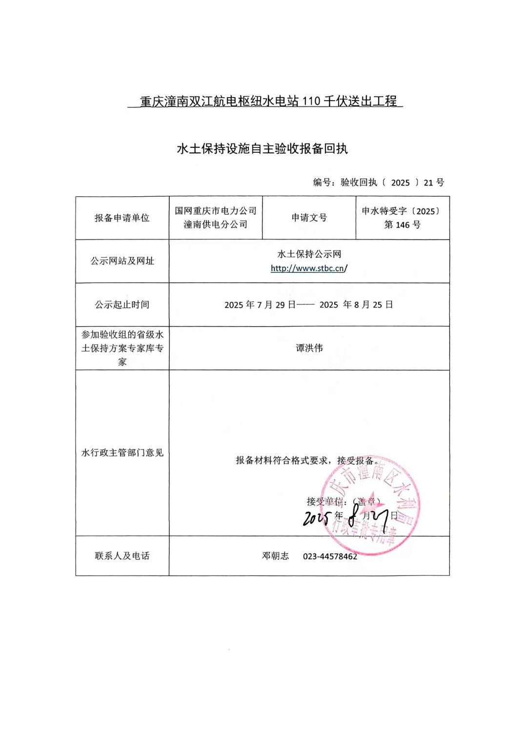 验收回执〔2025〕21号重庆潼南双江航电枢纽水电站110千伏送出工程水土保持设施自主验收报备回执
