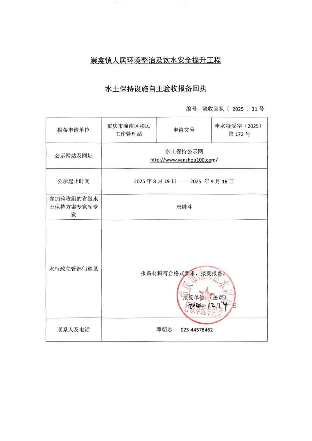 验收回执〔2025〕31号崇龛镇人居环境整治及饮水安全提升工程水土保持设施自主验收报备回执
