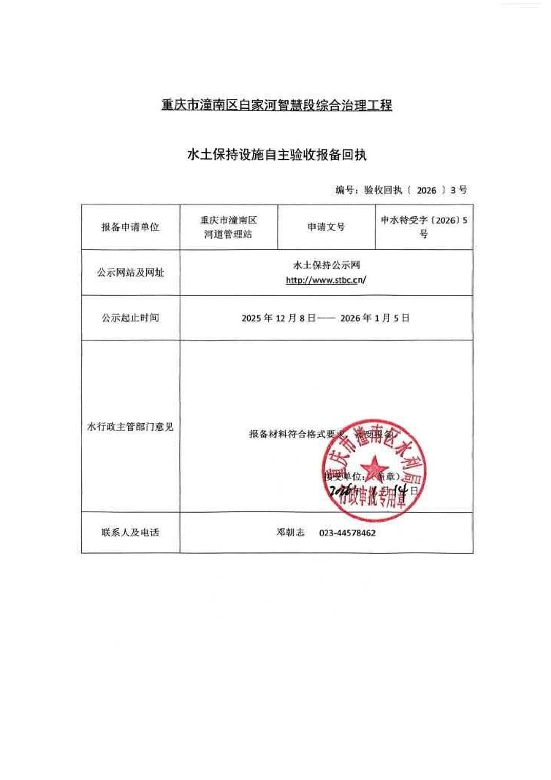 验收回执〔2026〕3号重庆市潼南区白家河智慧段综合治理工程水土保持设施自主验收报备回执