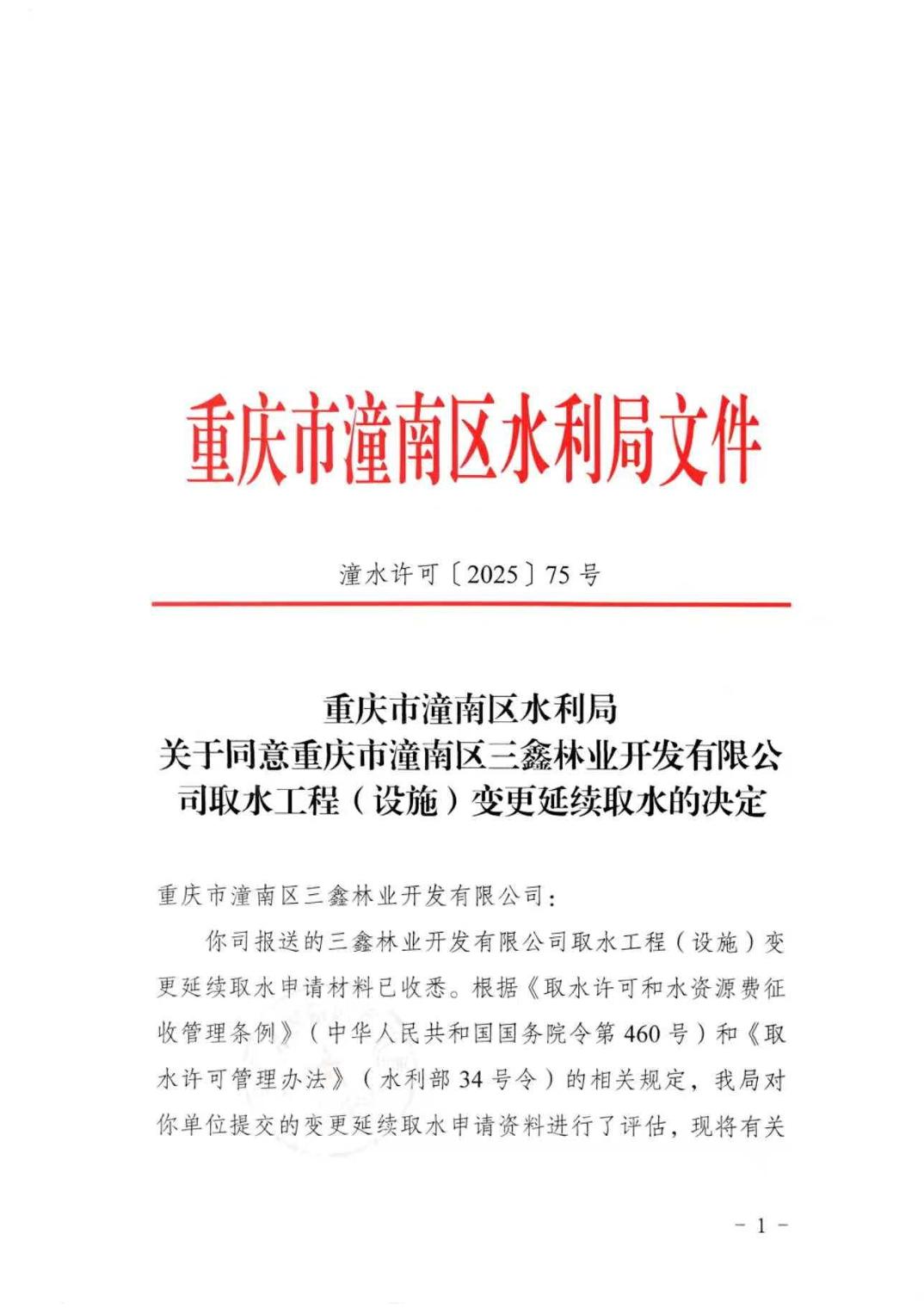 潼水许可〔2025〕75号关于同意重庆市潼南区三鑫林业开发有限公司取水工程(设施)延续取水的决定