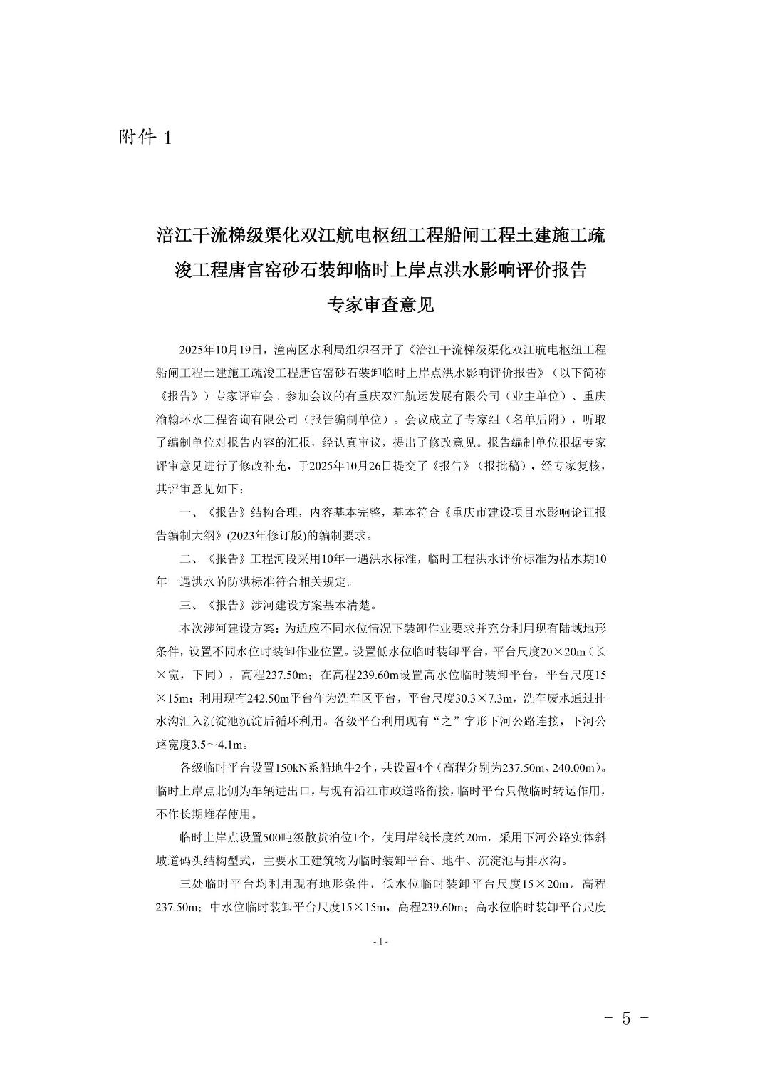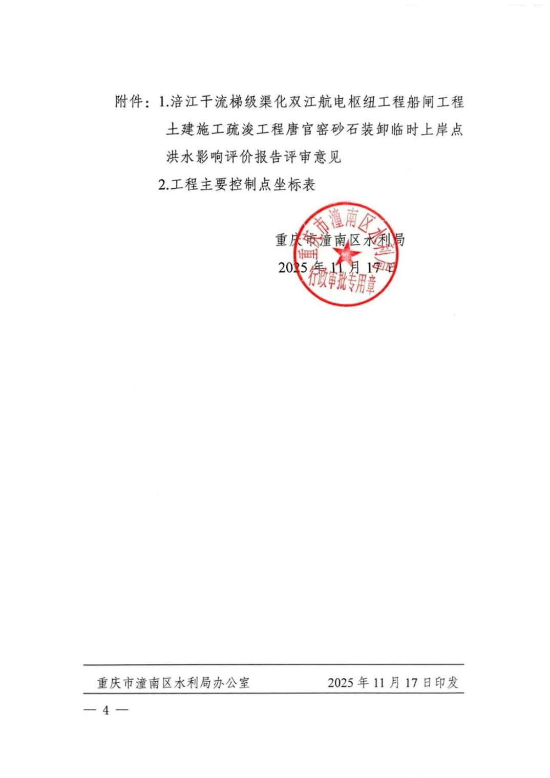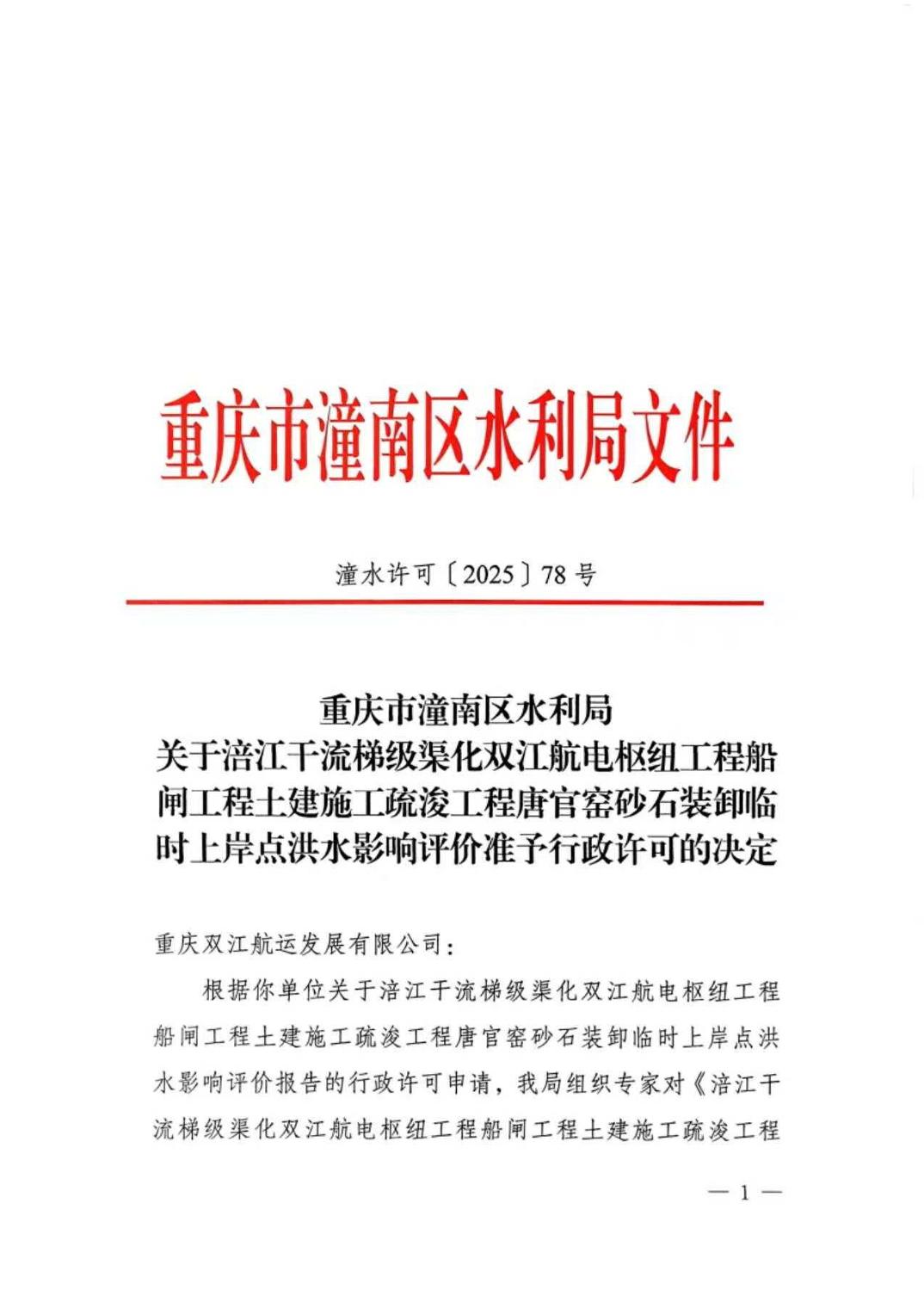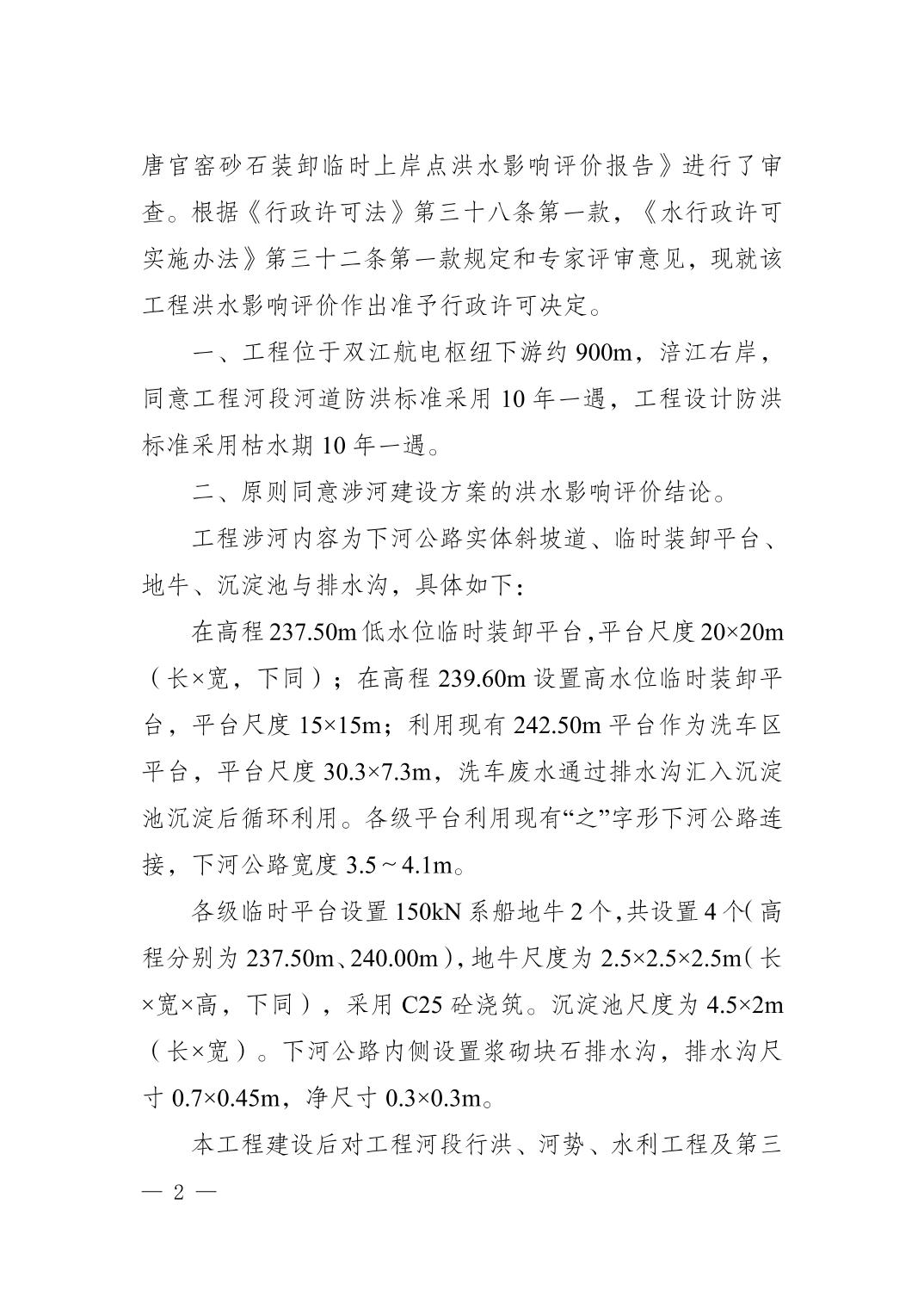 潼水许可〔2025〕78号涪江干流梯级渠化双江航电枢纽工程船闸工程土建施工疏浚工程唐官窑砂石装卸临时上岸点洪水影响评价的决定