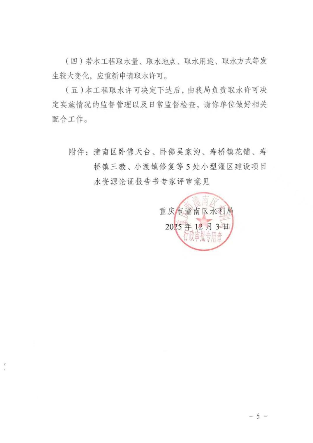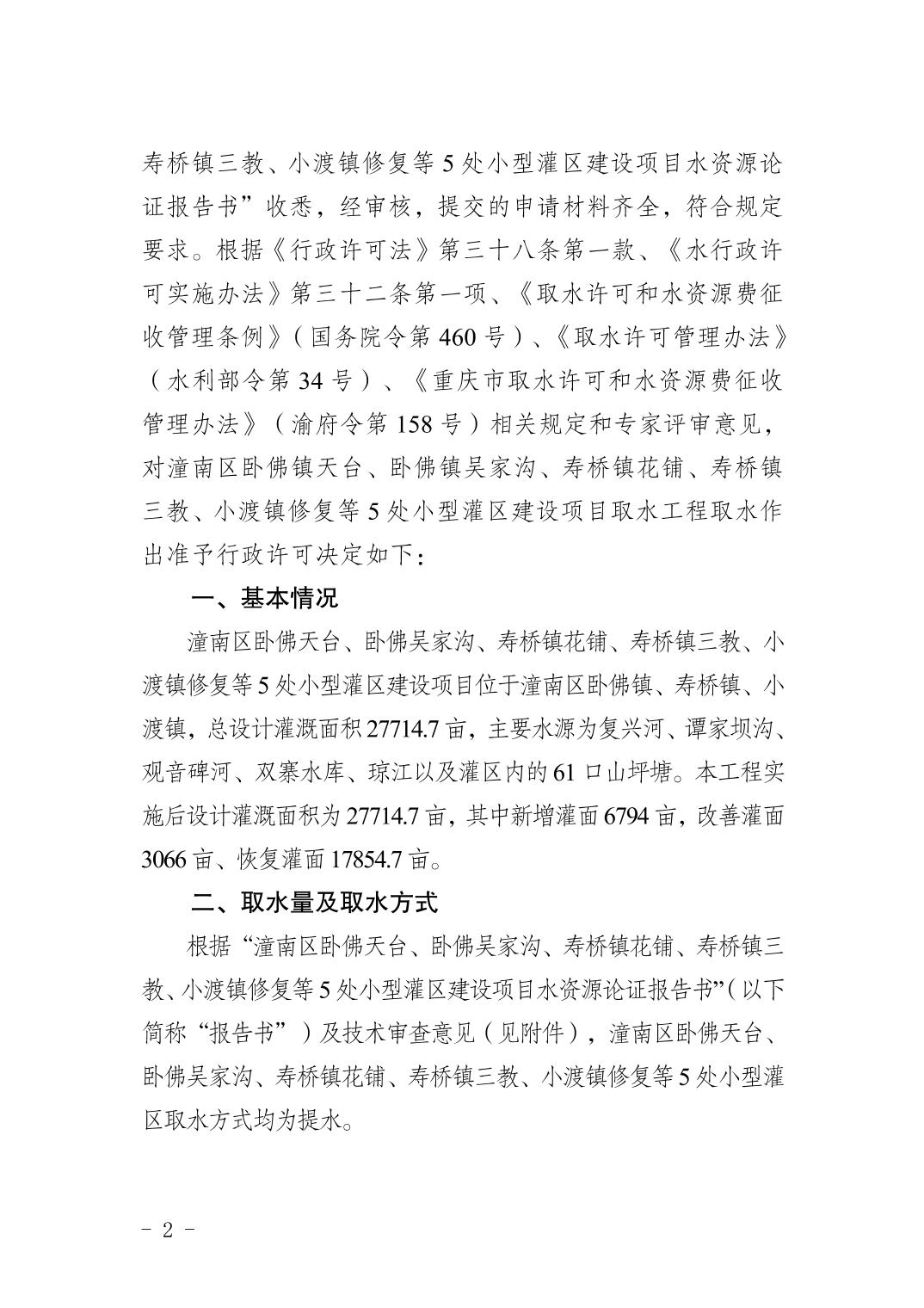 潼水许可〔2025〕81号 关于潼南区卧佛镇天台、卧佛镇吴家沟、寿桥镇花铺、寿桥镇三教、小渡镇修复等5处小型灌区建设项目取水工程取水准予行政许可的决定