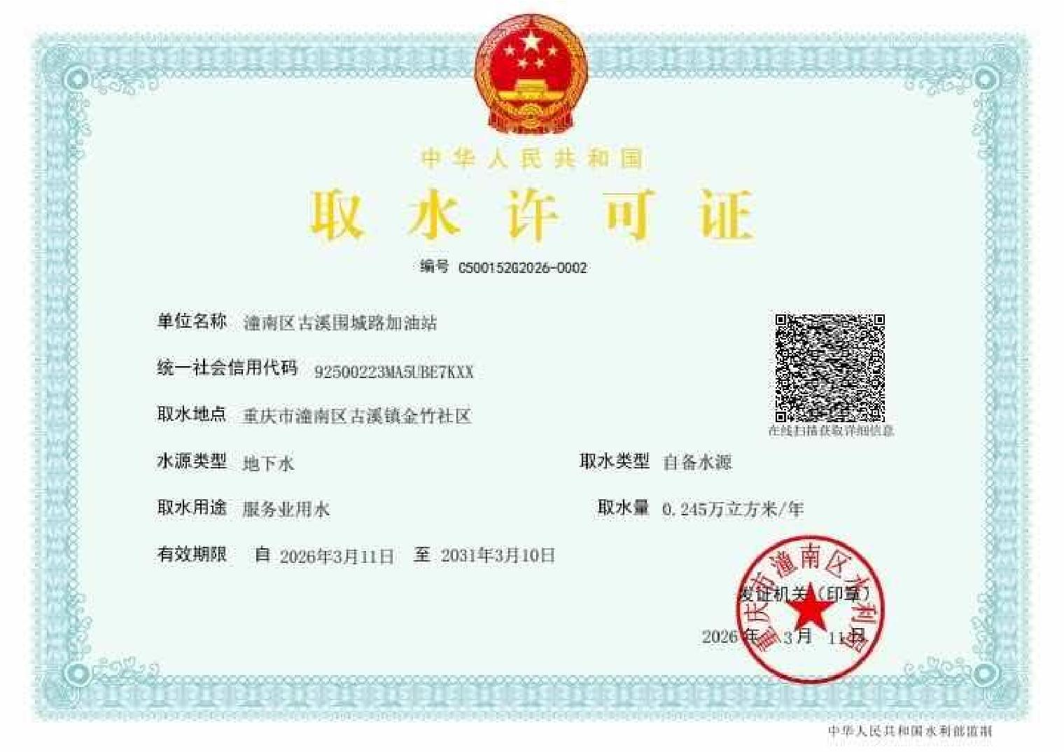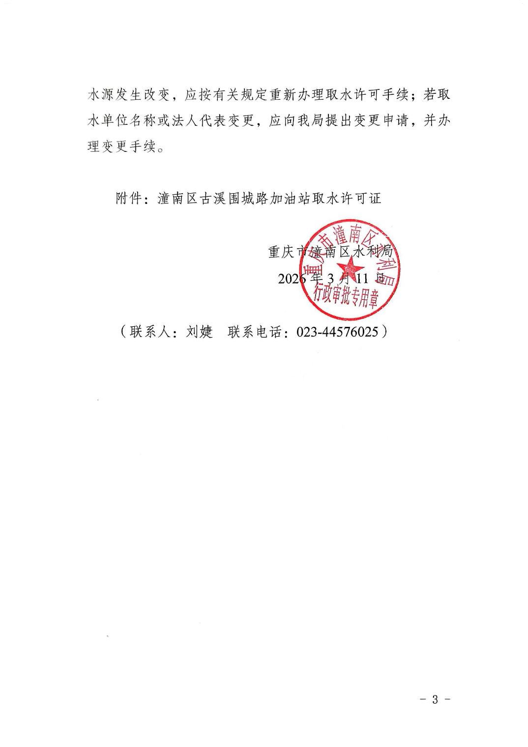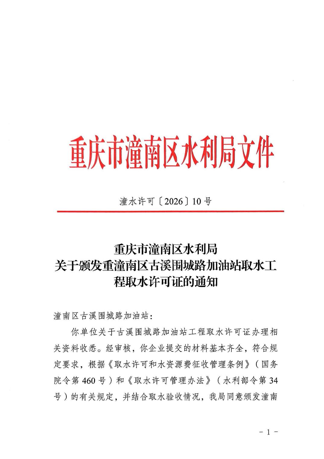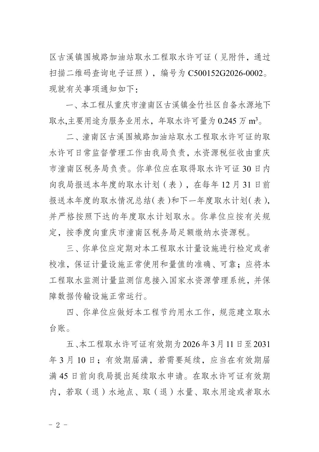 潼水许可〔2026〕10号关于颁发潼南区古溪围城路加油站取水工程取水许可证的通知
