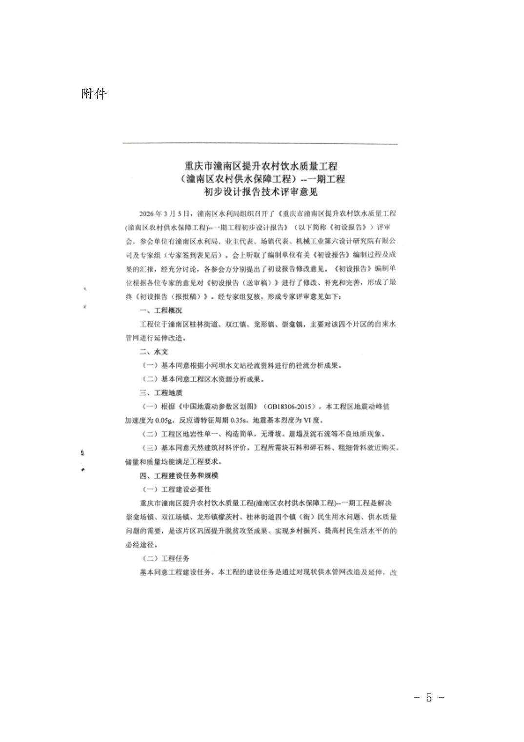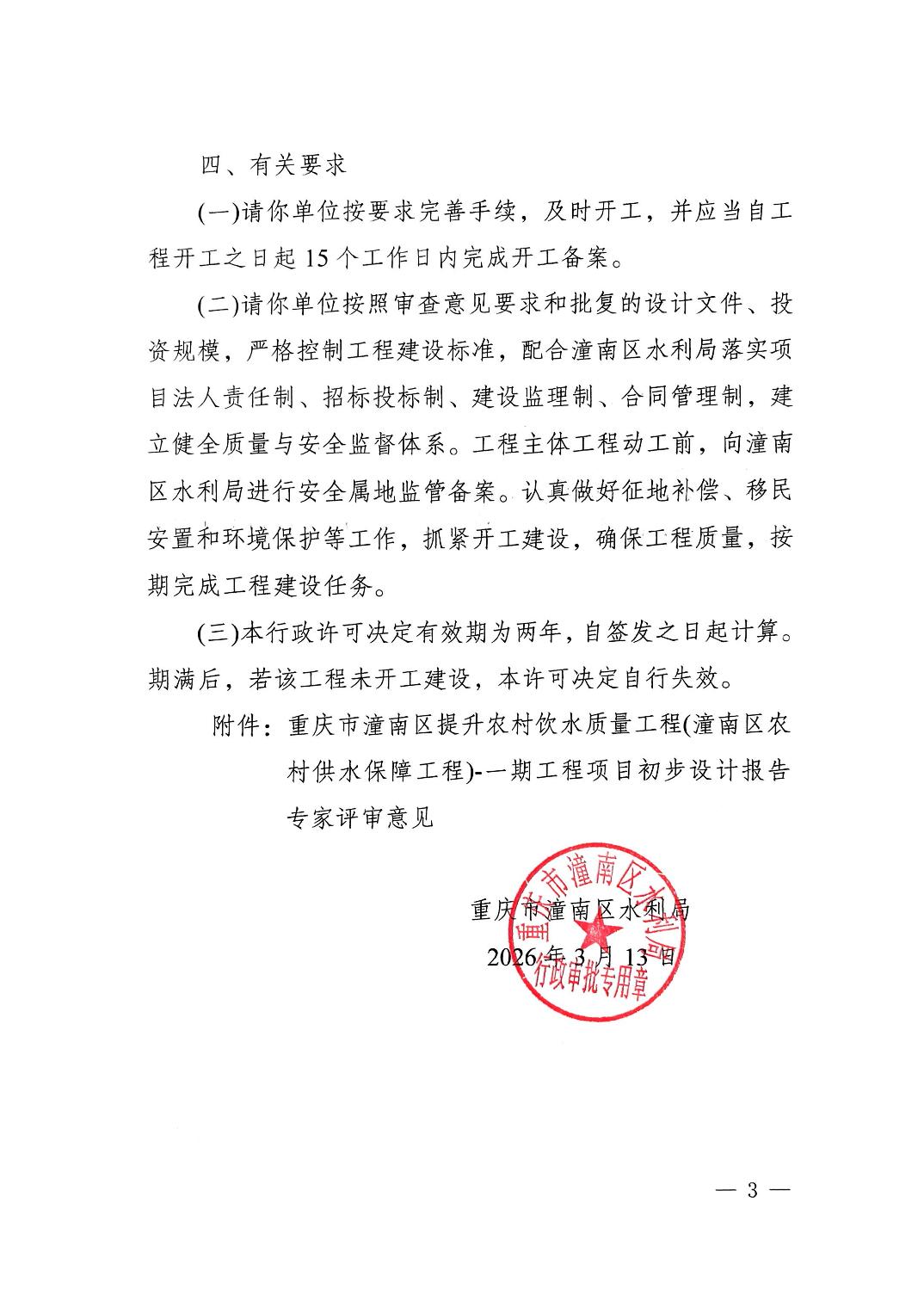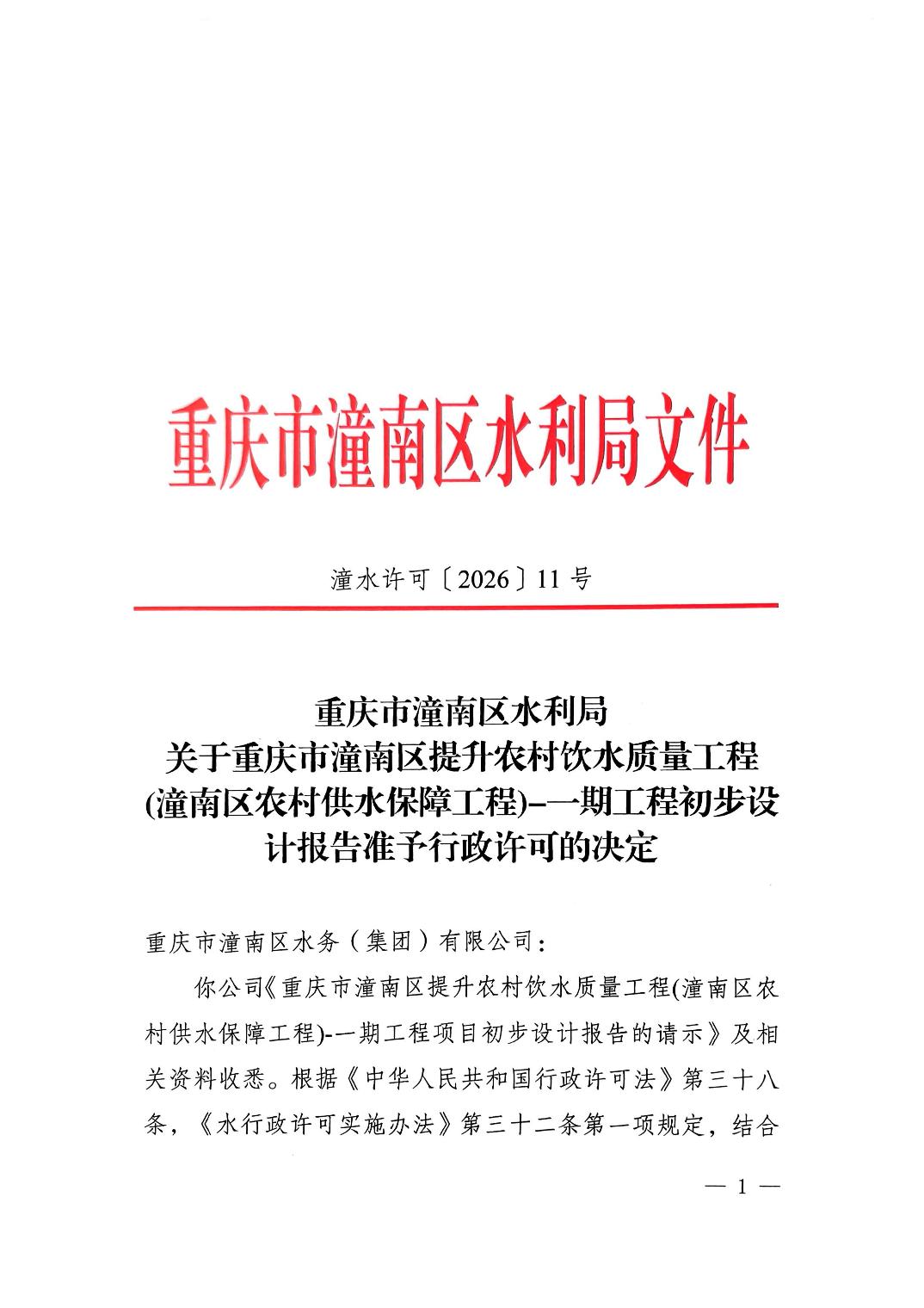 潼水许可〔2026〕11号关于重庆市潼南区提升农村饮水质量工程(潼南区农村供水保障工程)-一期工程项目初步设计报告准予行政许可的决定