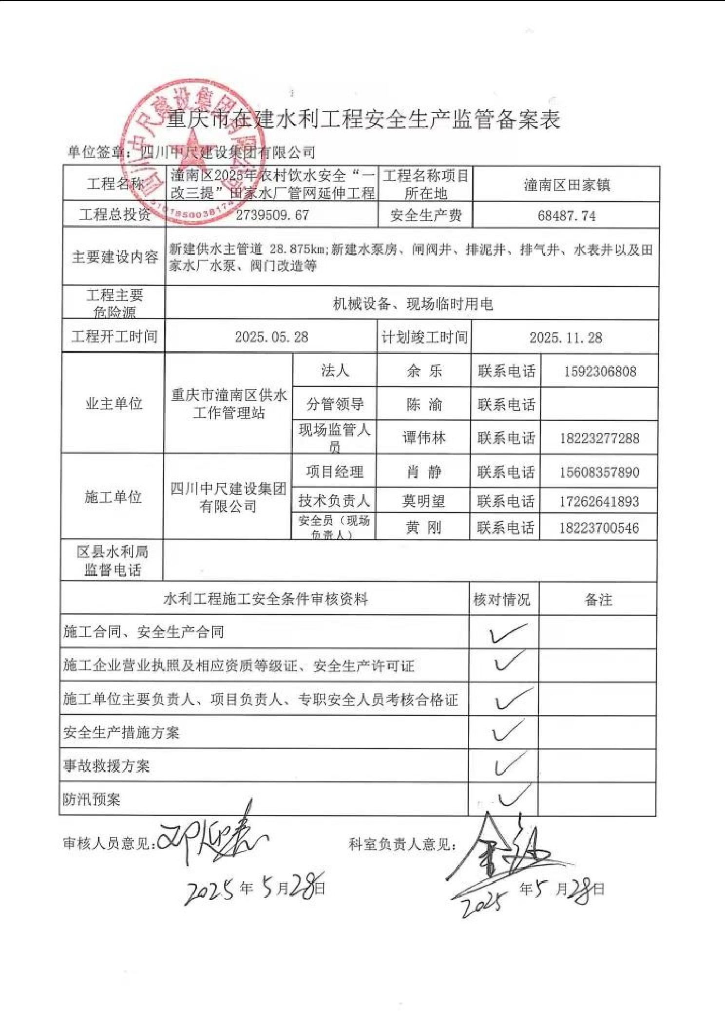 潼南区农村饮水“一改三提”田家水厂安全生产监管备案