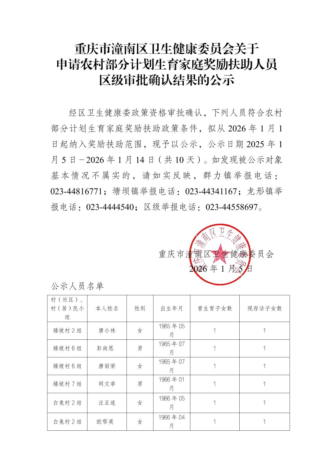 重庆市潼南区卫生健康委员会关于申请农村部分计划生育家庭奖励扶助人员区级审批确认结果的公示