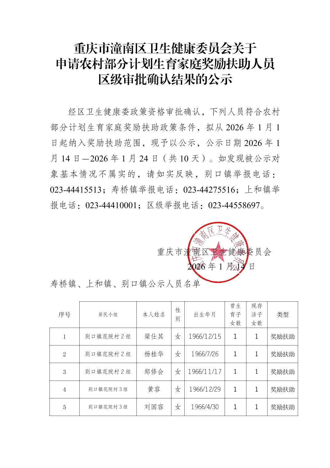 重庆市潼南区卫生健康委员会关于申请农村部分计划生育家庭奖励扶助人员区级审批确认结果的公示