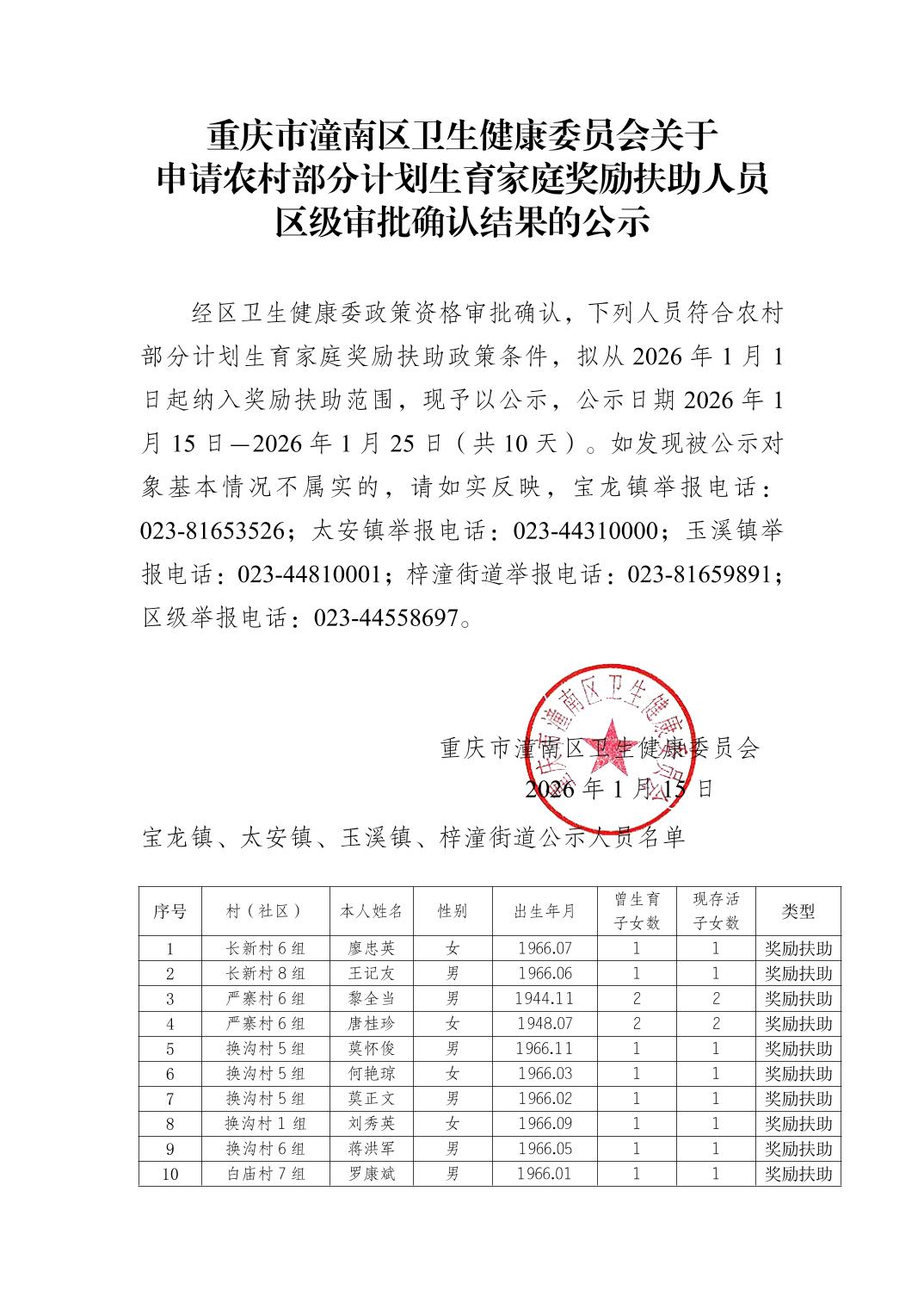 重庆市潼南区卫生健康委员会关于申请农村部分计划生育家庭奖励扶助人员区级审批确认结果的公示