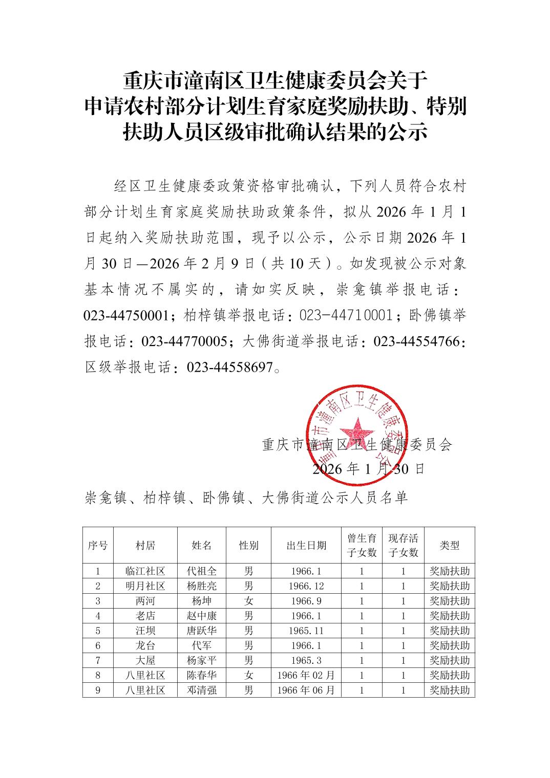 重庆市潼南区卫生健康委员会关于申请农村部分计划生育家庭奖励扶助、特别扶助人员区级审批确认结果的公示