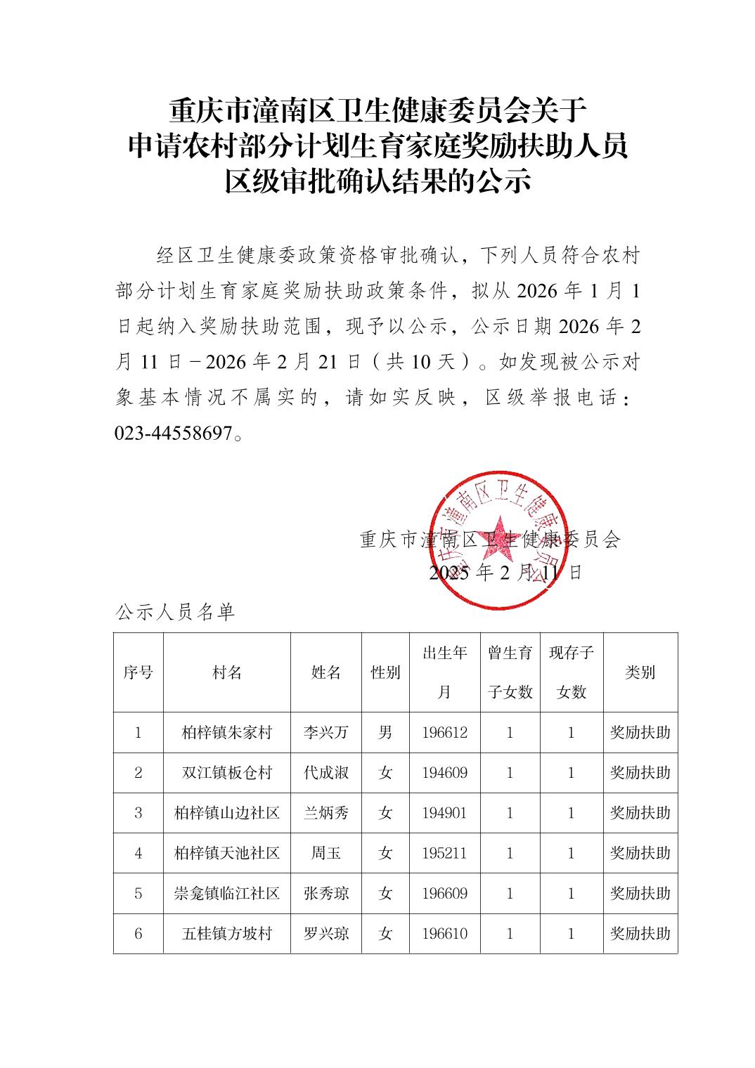 重庆市潼南区卫生健康委员会关于申请农村部分计划生育家庭奖励扶助人员区级审批确认结果的公示