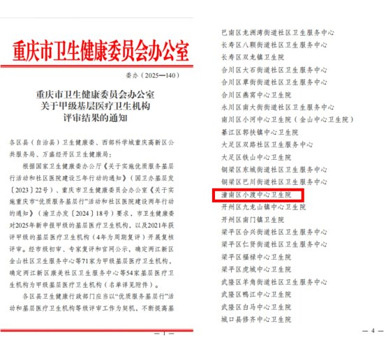 近日,市卫生健康委公布《关于甲级基层医疗卫生机构评审结果的通知》,潼南区小渡中心卫生院成功创建为“甲级基层医疗卫生机构”。