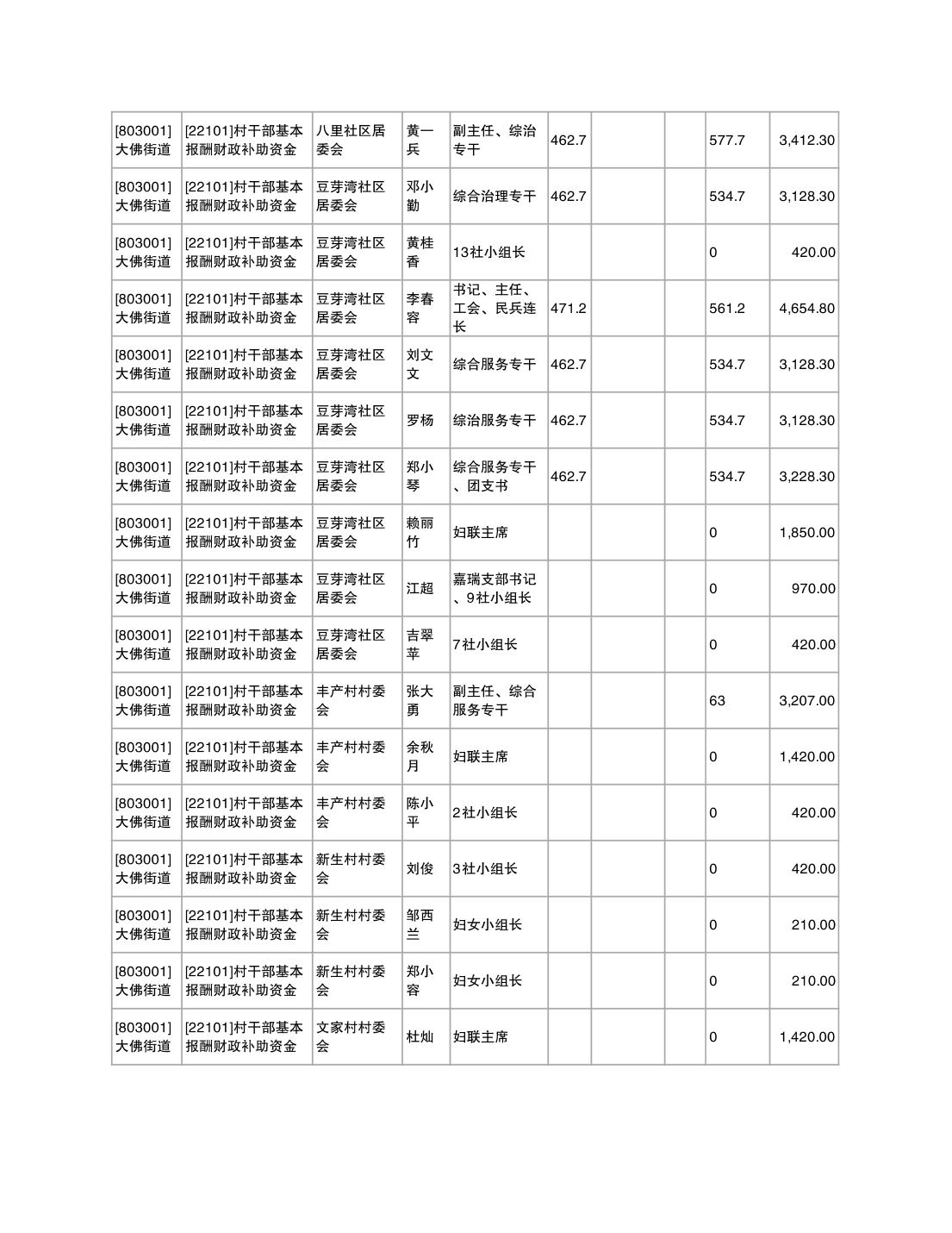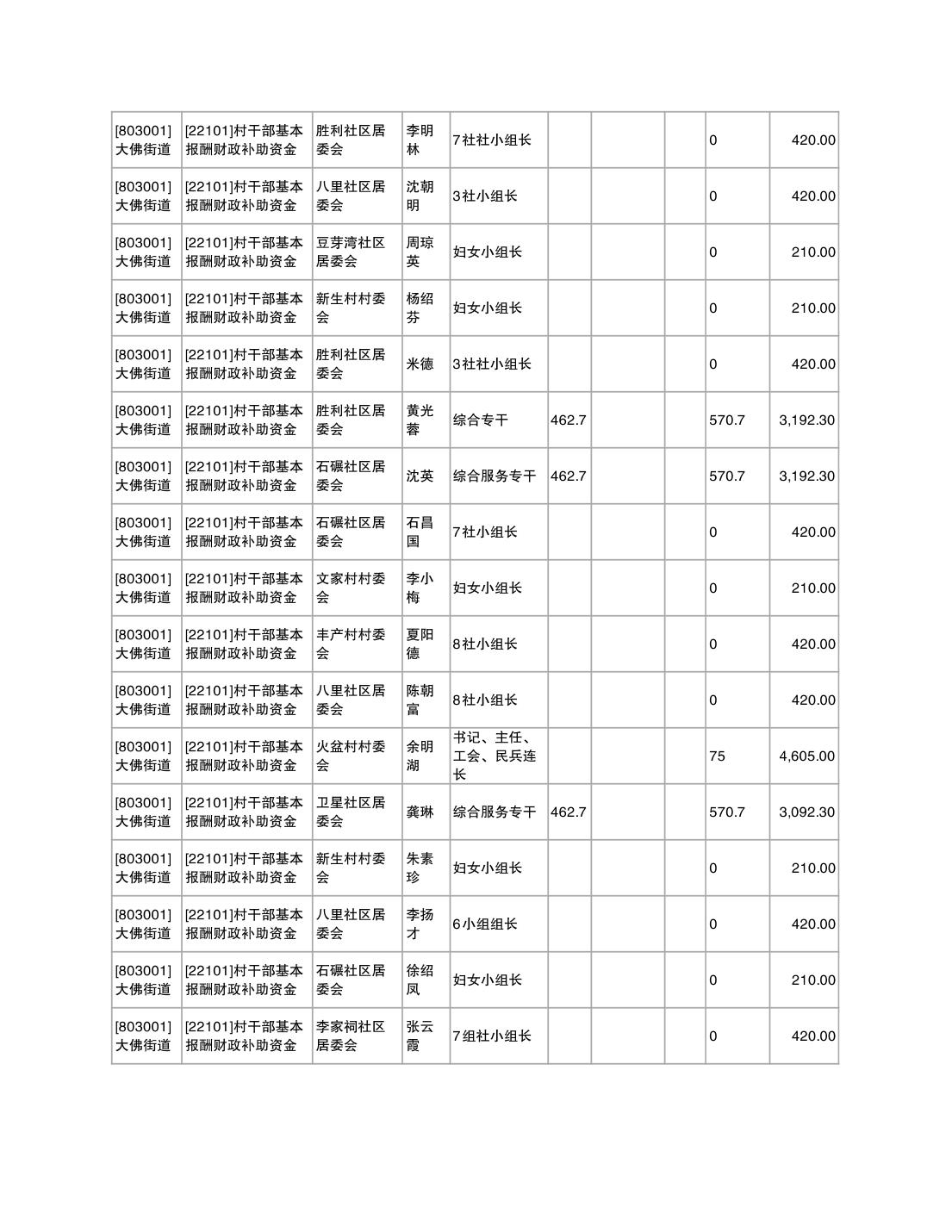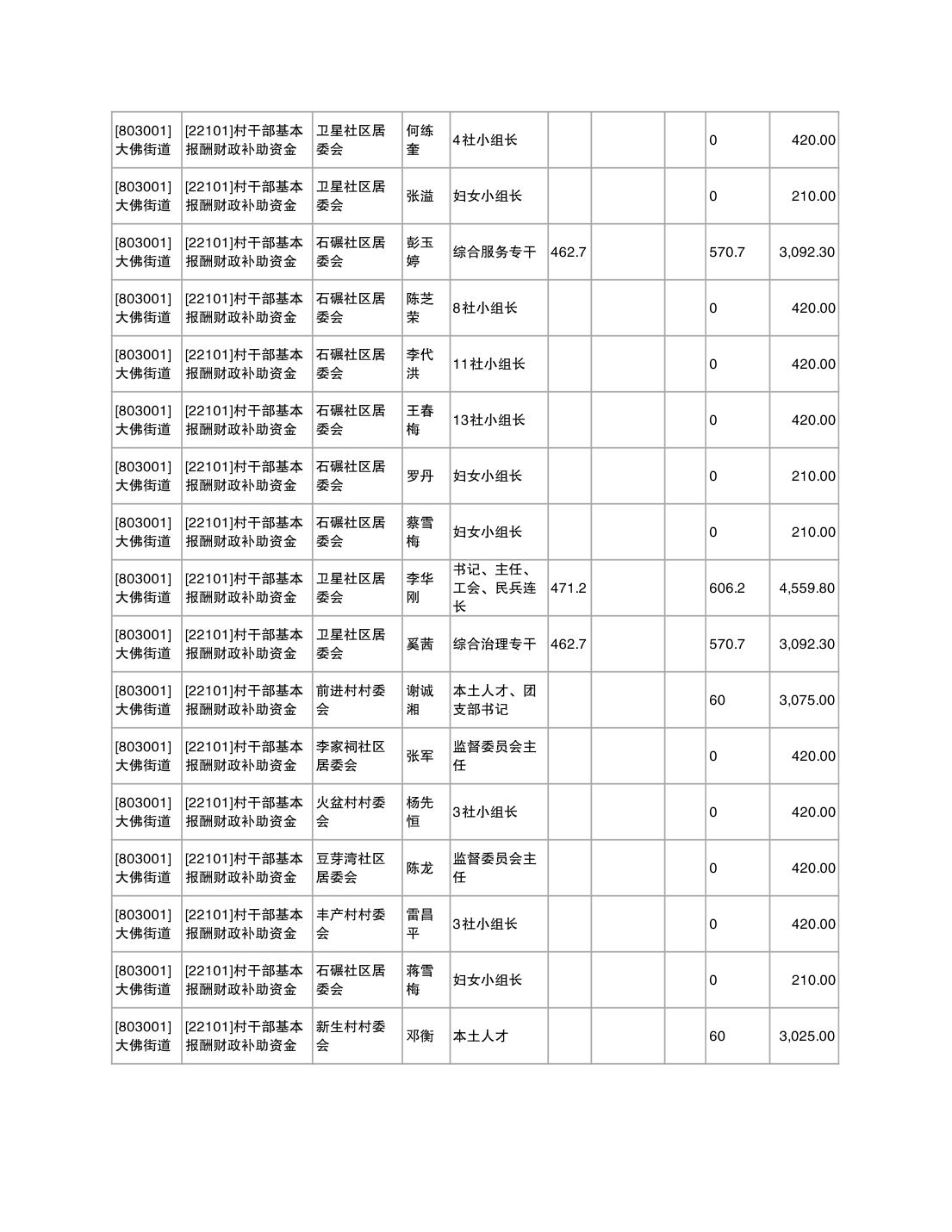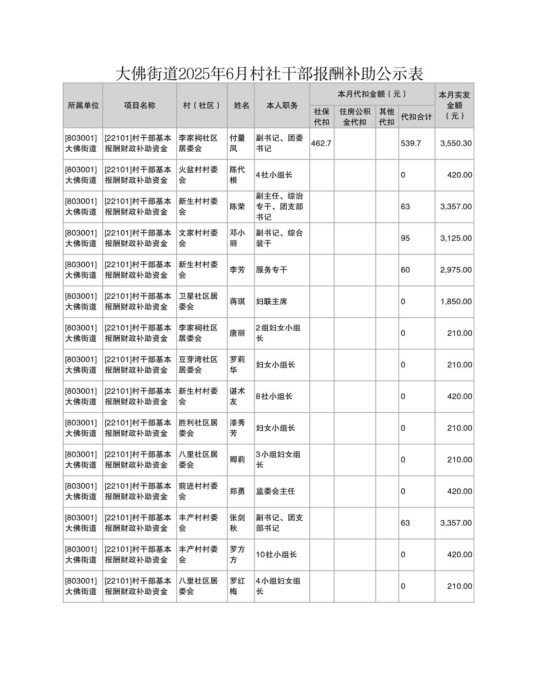 重庆市潼南区大佛街道6月村社干部报酬补助公示表