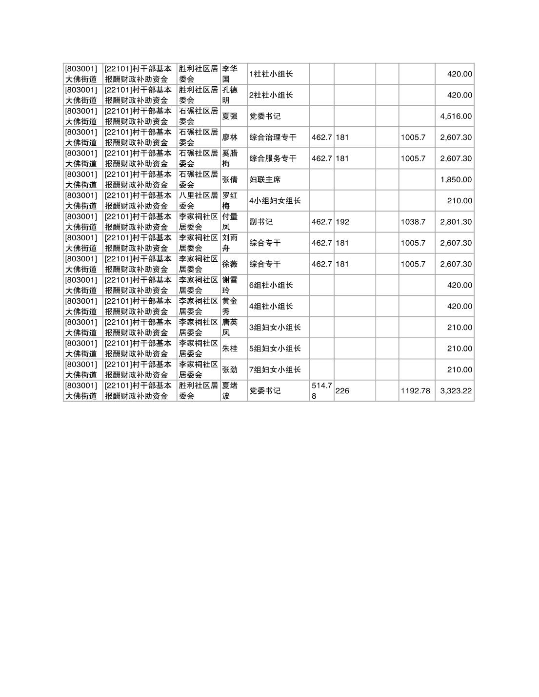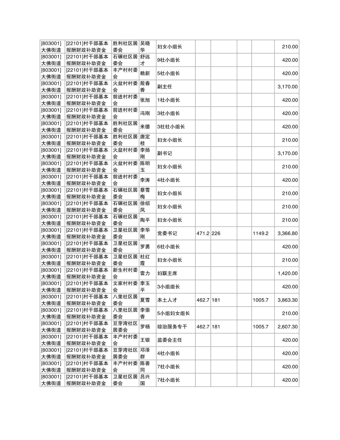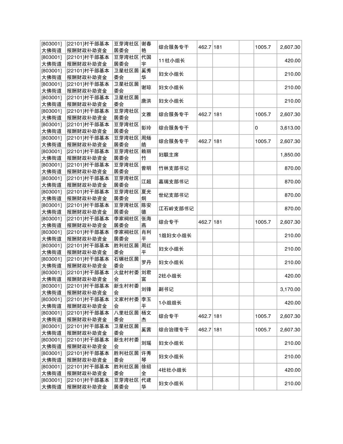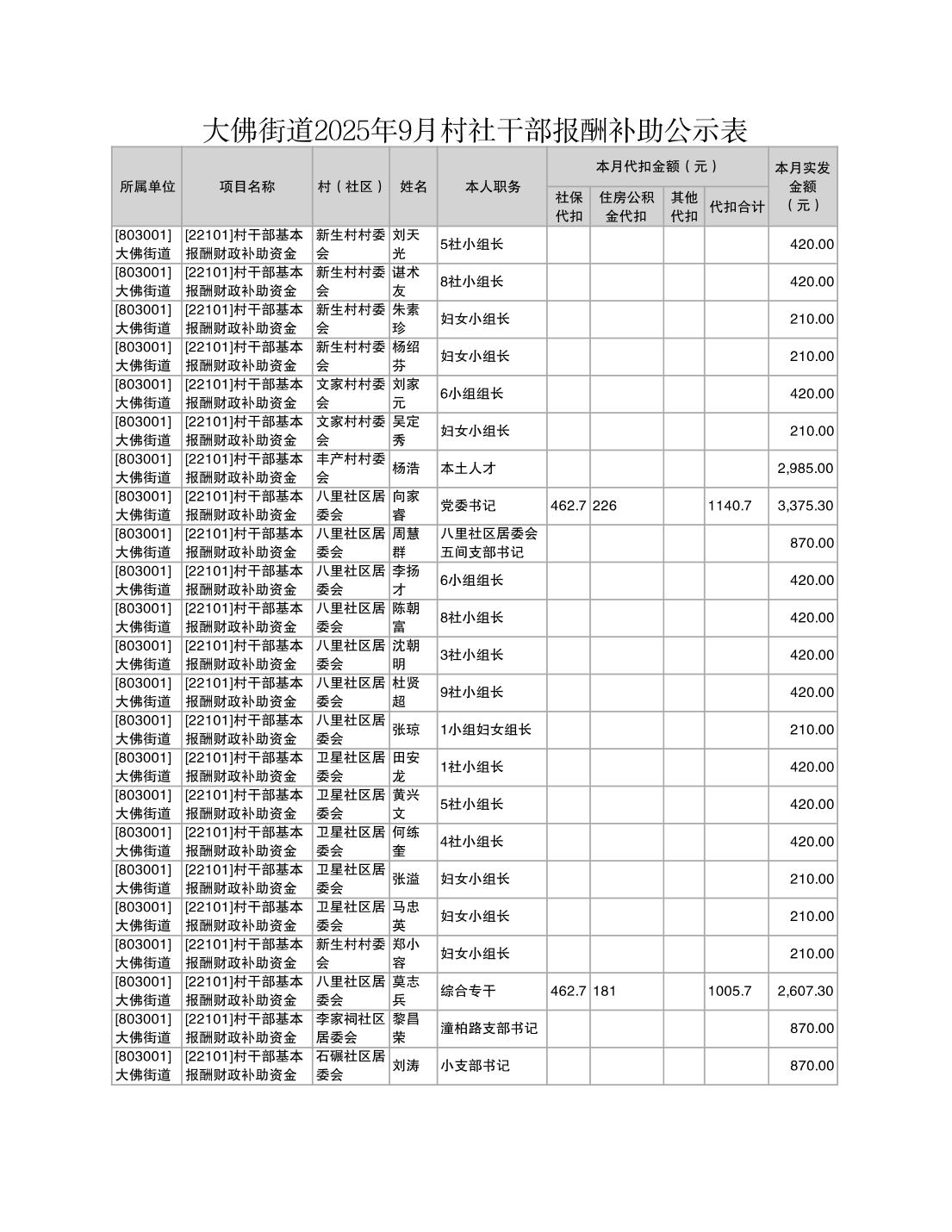 重庆市潼南区大佛街道9月村社干部报酬补助公示表