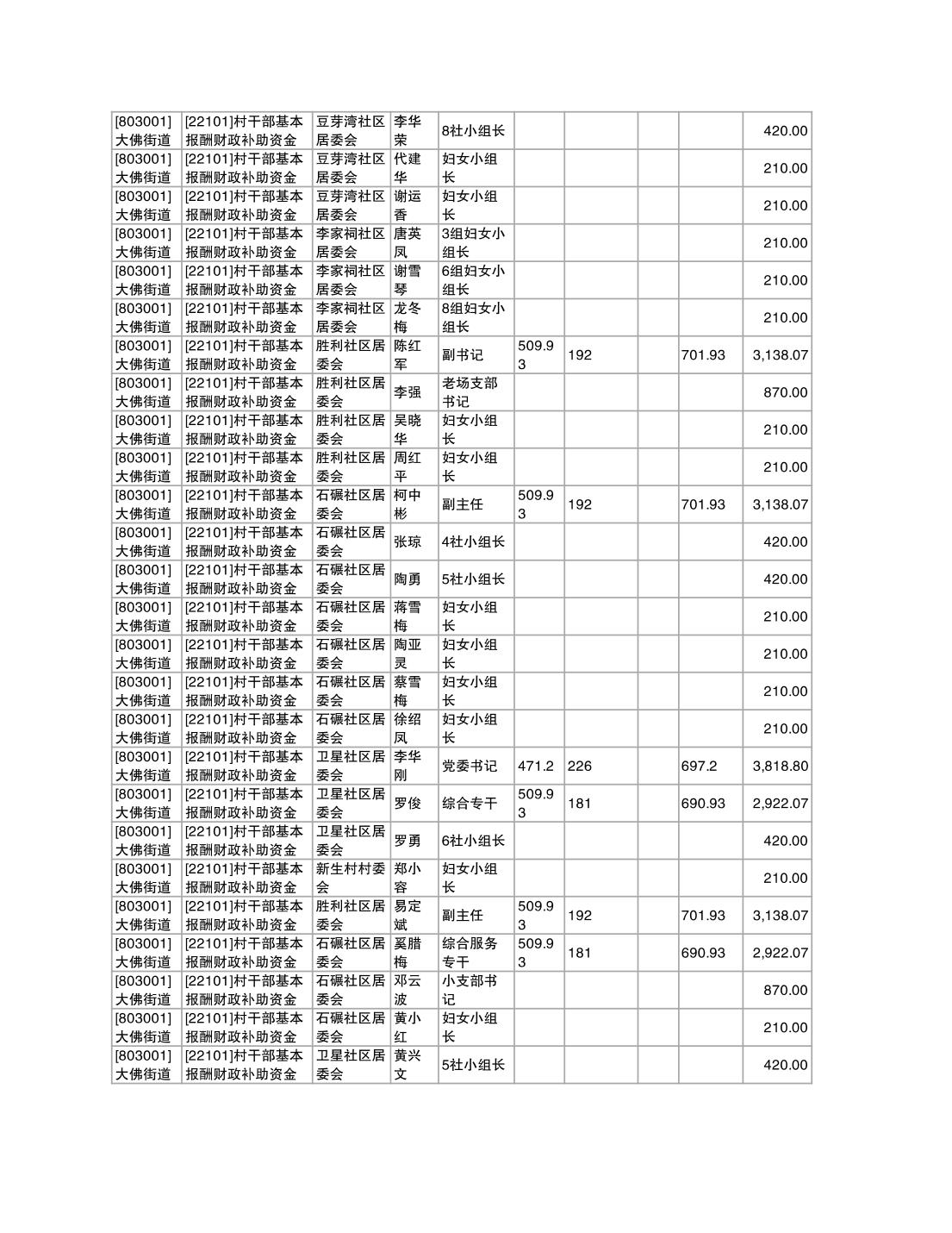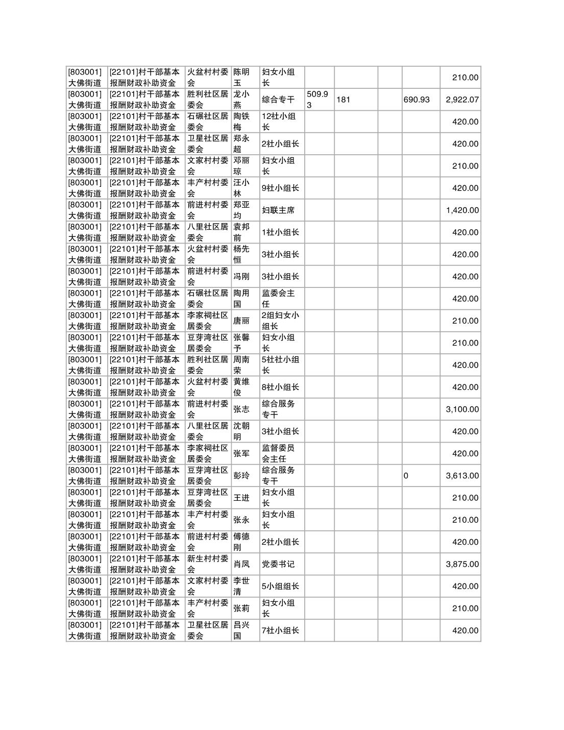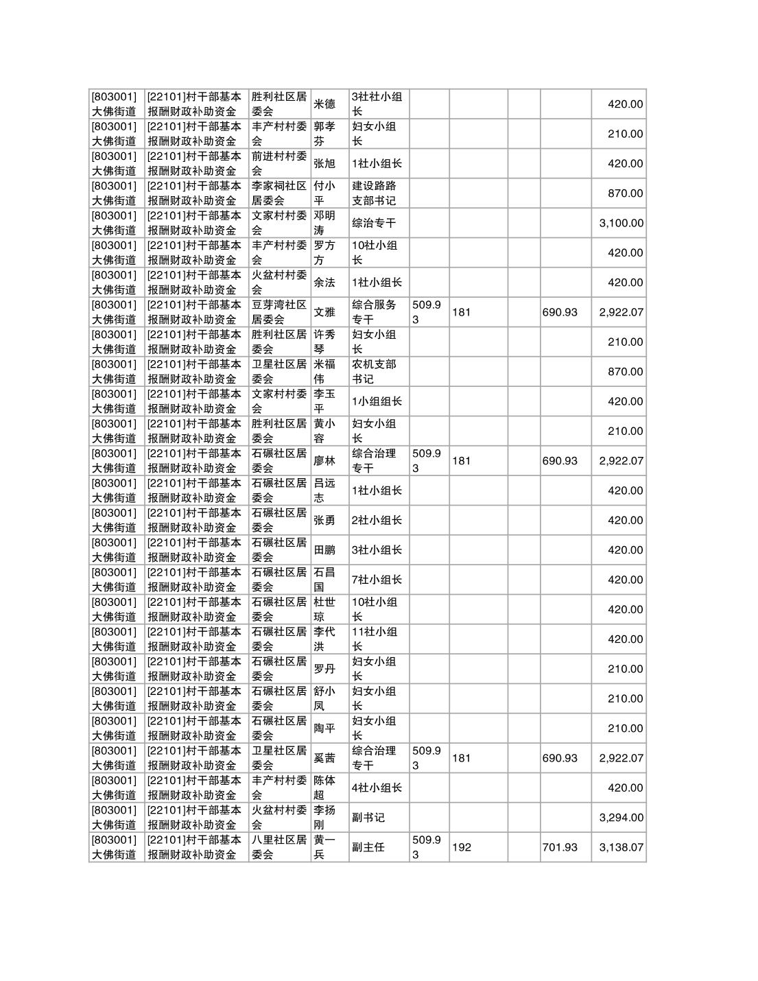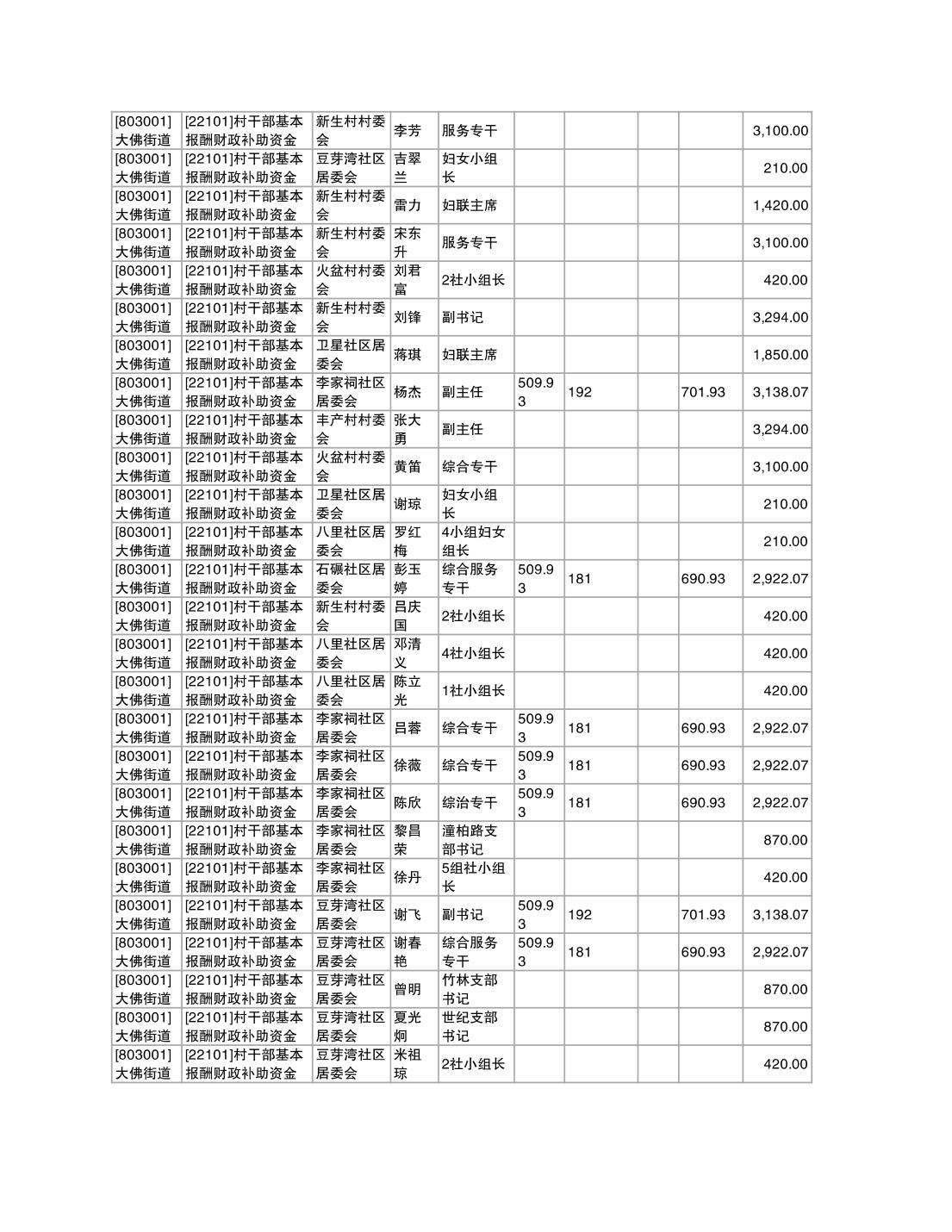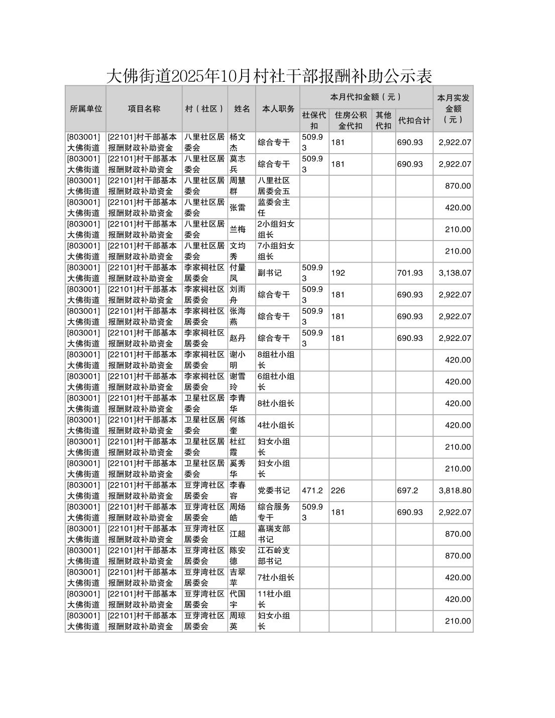 重庆市潼南区大佛街道10月村社干部报酬补助公示表