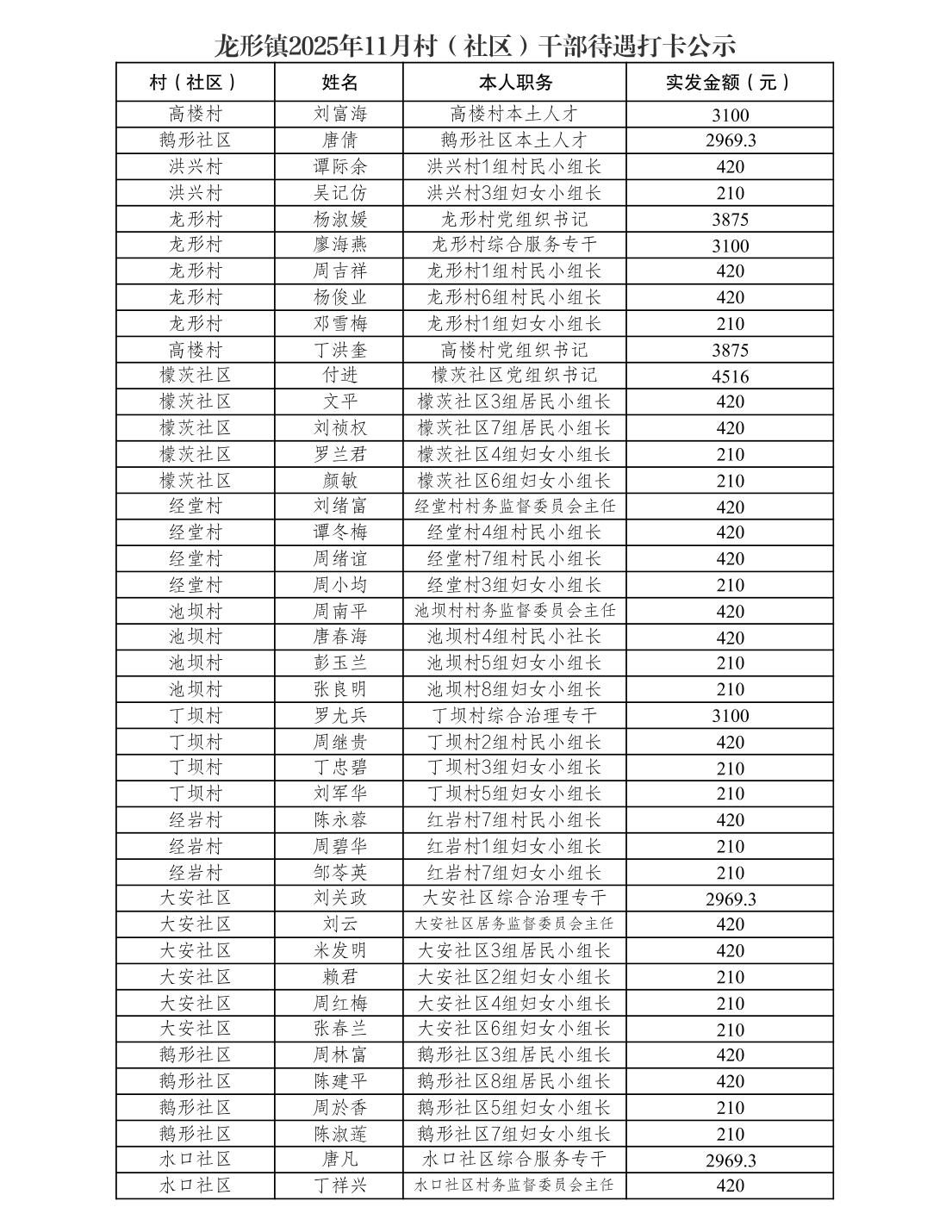 龙形镇2025年11月村(社区)干部待遇打卡公示