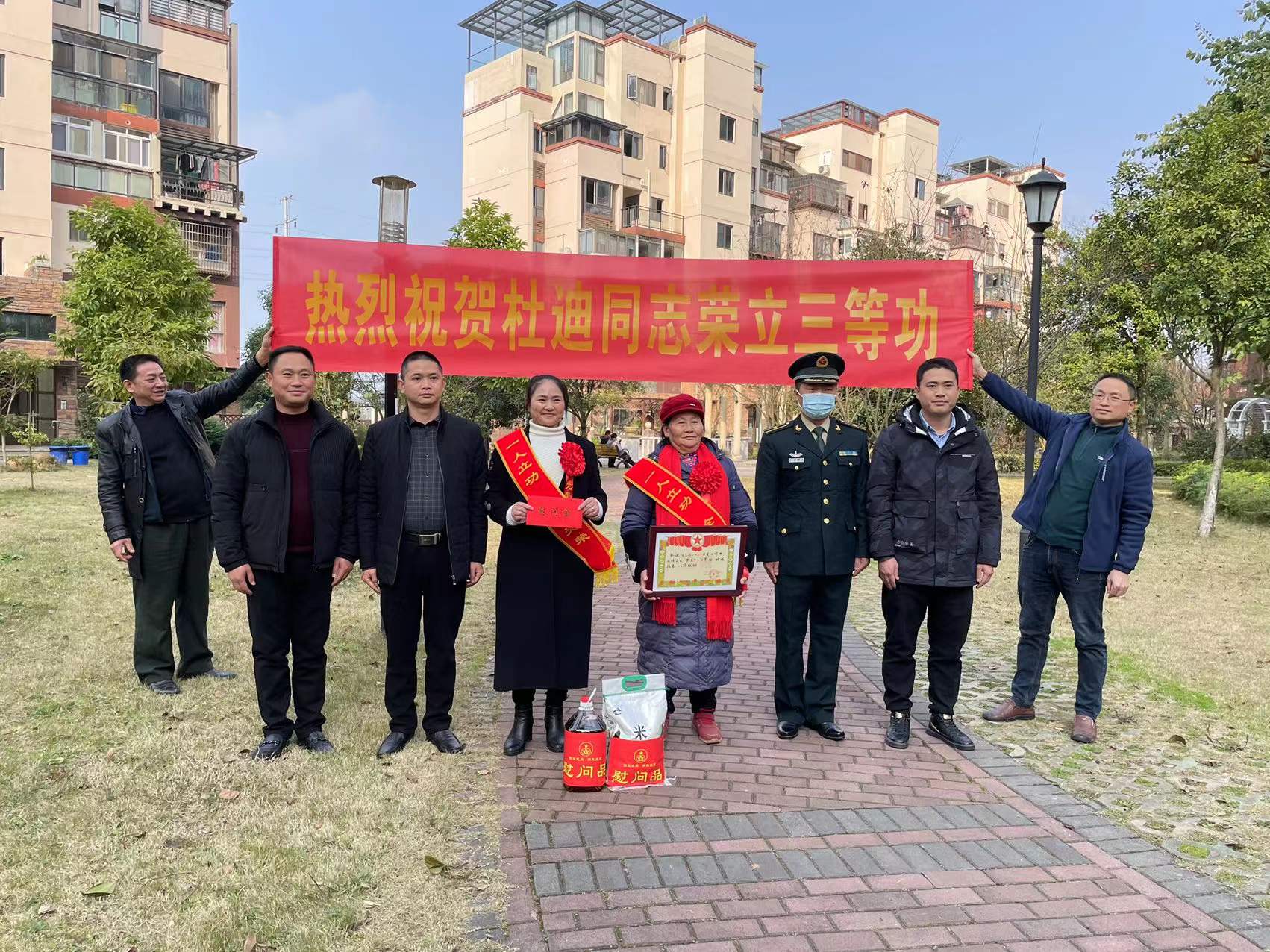 2021年12月22日下午,桂林街道党工委委员,人武部长刘海同志和区退役军人事务局副局长姚传波同志及部队领导来到左岸春天住宅小区为三等功获得者杜迪的家属送喜报及慰问物资,并为他们披上红绶带。街道党工委委员,人武部长刘海同志与军属亲切交谈,详细询问他们的工作、生活情况,并对他们为军队培养了优秀人才表示衷心的感谢。杜迪的母亲刘小华表示孩子能在部队表现突出荣立三等功,感到很欣慰,感谢国家和部队的培养。据息,杜迪2011年就读于中国解放军信息工程大学,毕业后在广东省清远市某部队服役,上尉军官。在2021年度工作中成绩突出,荣获三等功奖励。