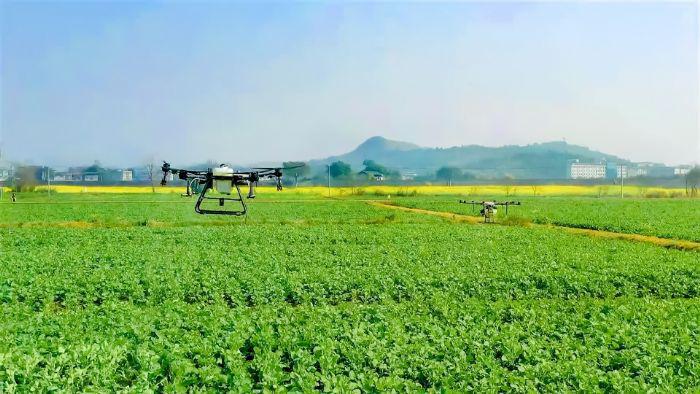 无人机正在给油菜田施肥。