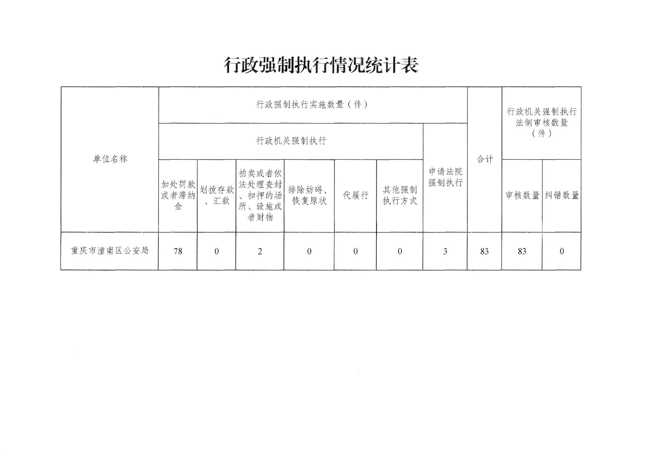 按照市政府、公安部关于“三项制度”工作统一部署,根据《重庆市公安局全面推行行政执法公示制度执法全过程记录制度重大执法决定法制审核制度实施方案》(渝公警令〔2019〕121号)工作要求,现将2025年度行政执法数据进行公示。