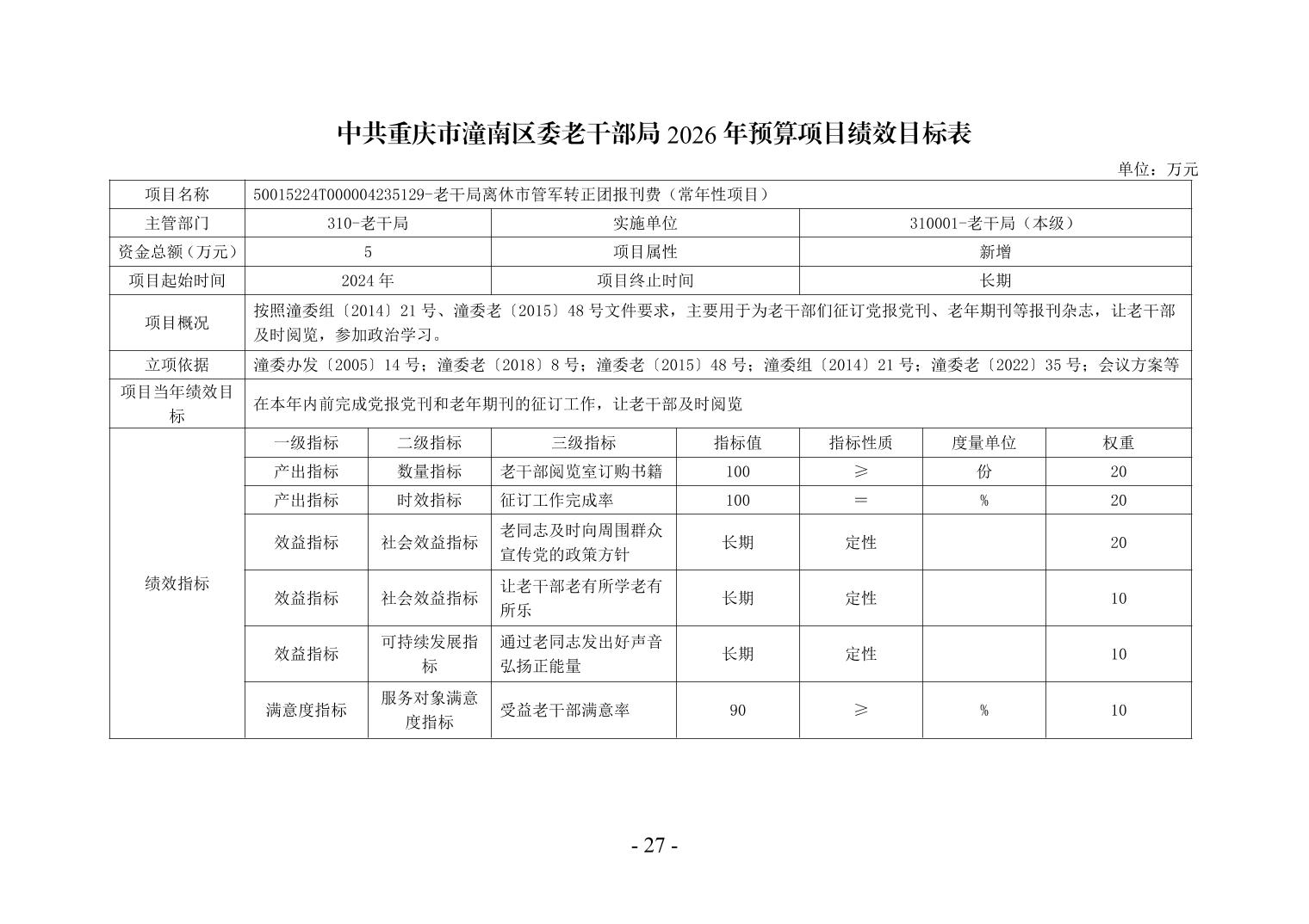 中共重庆市潼南区委老干部局2026年部门预算公开