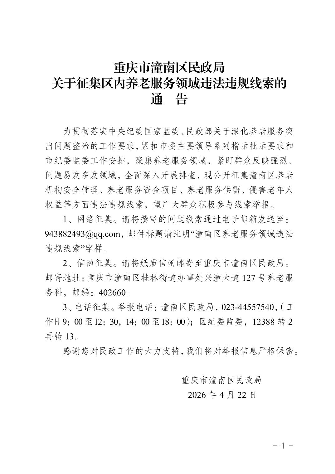 重庆市潼南区民政局关于征集区内养老服务领域违法违规线索的通告