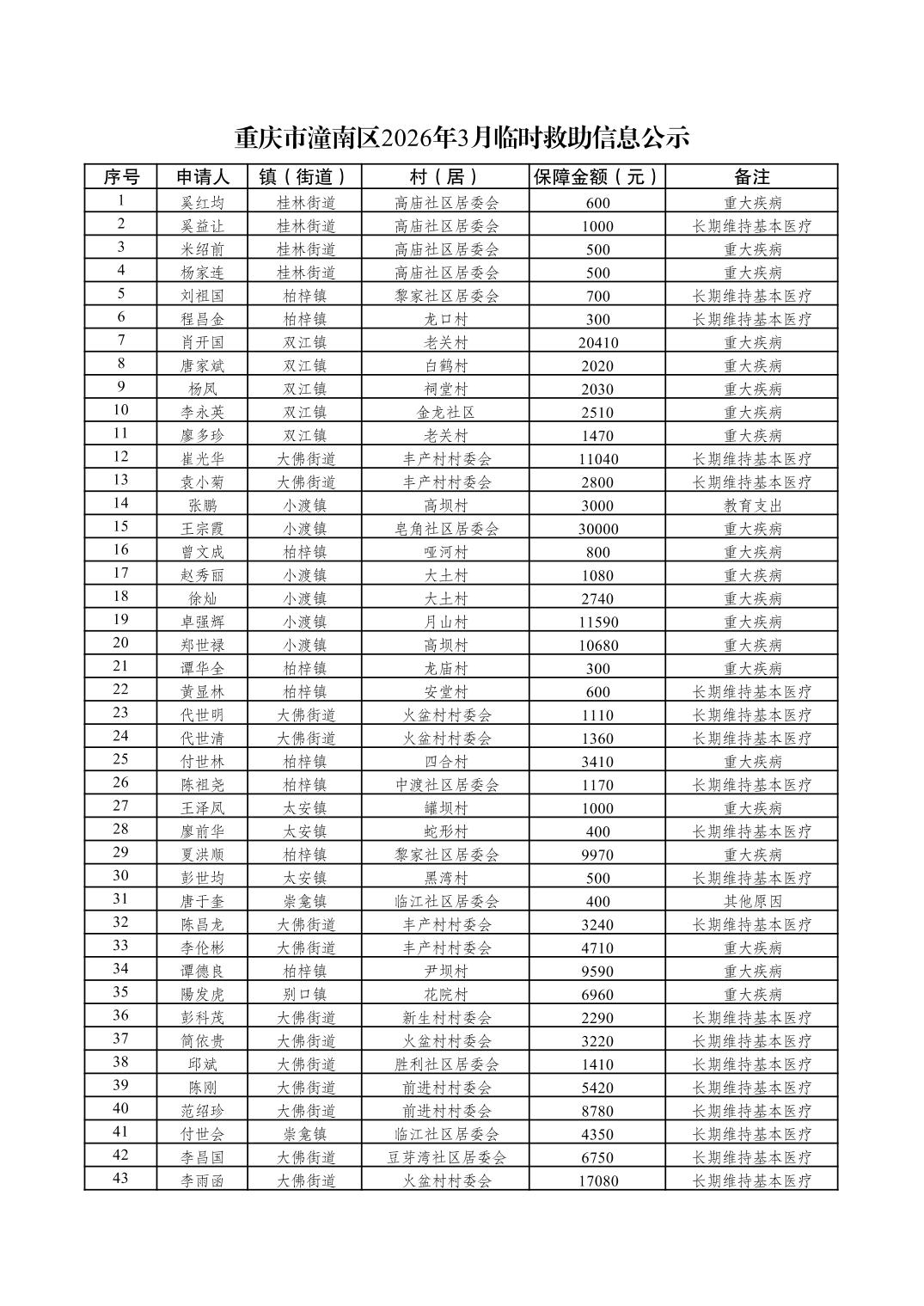 重庆市潼南区2026年3月临时救助信息公示