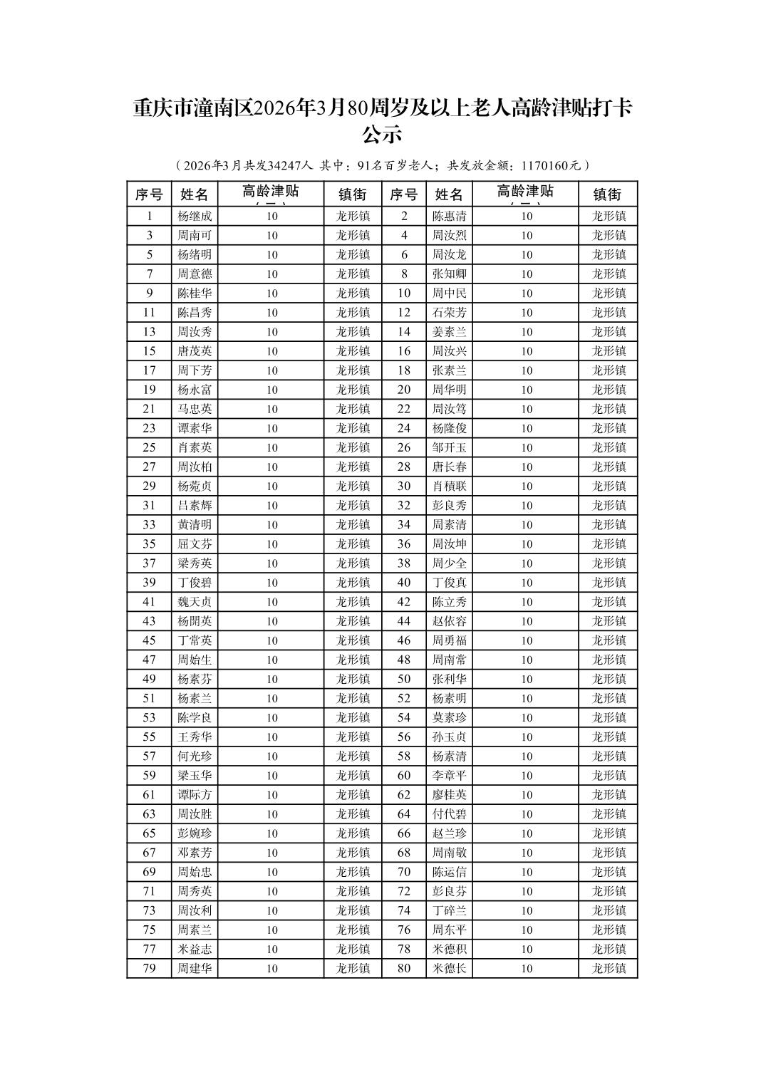 重庆市潼南区2026年3月80周岁及以上老人高龄津贴打卡公示