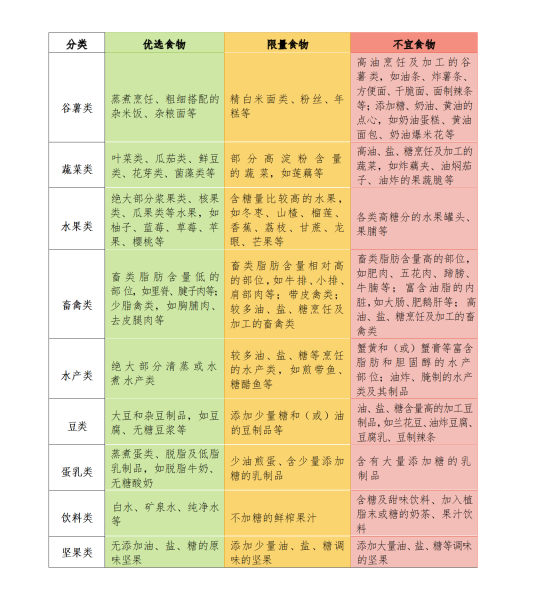 选择能量较低、微量营养素密度较高和血糖生成指数较低的食物,少吃高油、高盐和高糖及能量密度较高的食物。各类食物选择举例见下表。