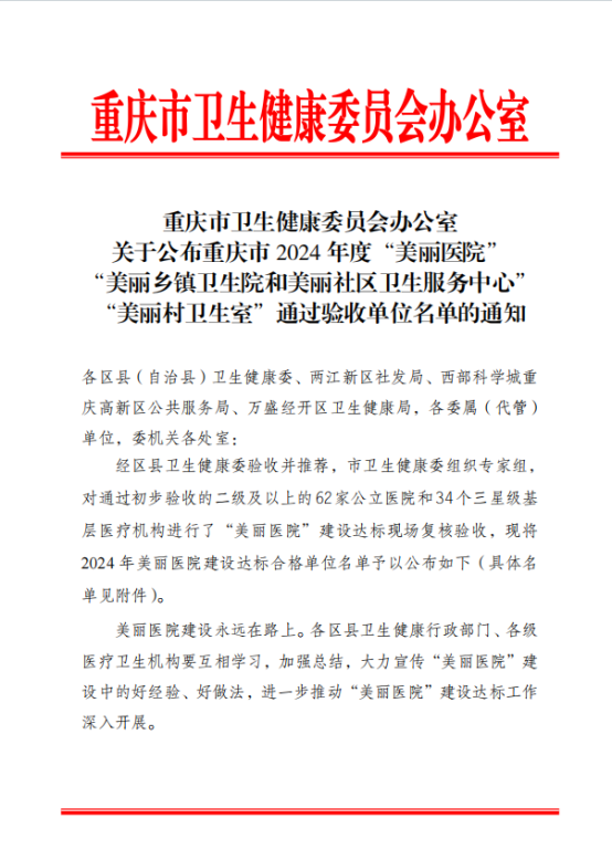 近日,市卫生健康委发布《关于公布重庆市2024年度“美丽医院”“美丽乡镇卫生院和美丽社区卫生服务中心”“美丽村卫生室”通过验收单位名单的通知》,潼南区8家医疗机构通过市卫生健康委验收。 其中,区人民医院获得四星级“美丽医院”称号,塘坝、双江中心卫生院获得三星级“美丽乡镇卫生院”称号,桂林、大佛街道社区卫生服务中心获得二星级“美丽社区卫生服务中心”称号,柏梓、古溪中心卫生院和米心镇卫生院获得二星级“美丽乡镇卫生院”称号。 在此,表示衷心祝贺!