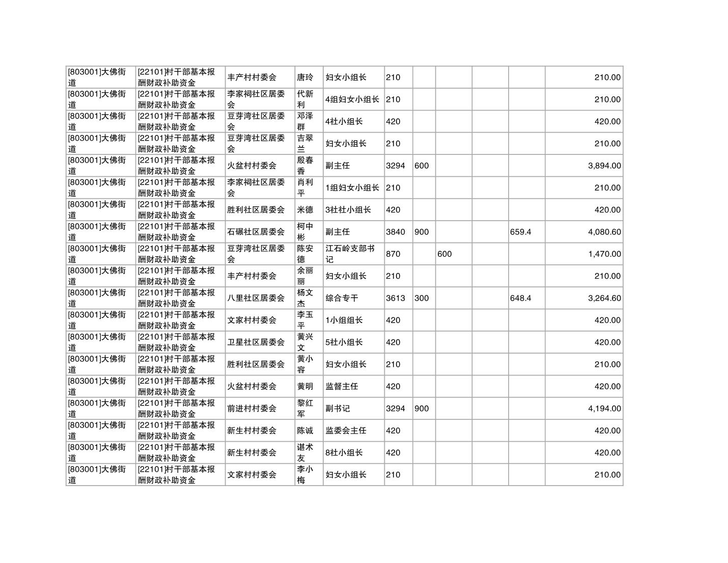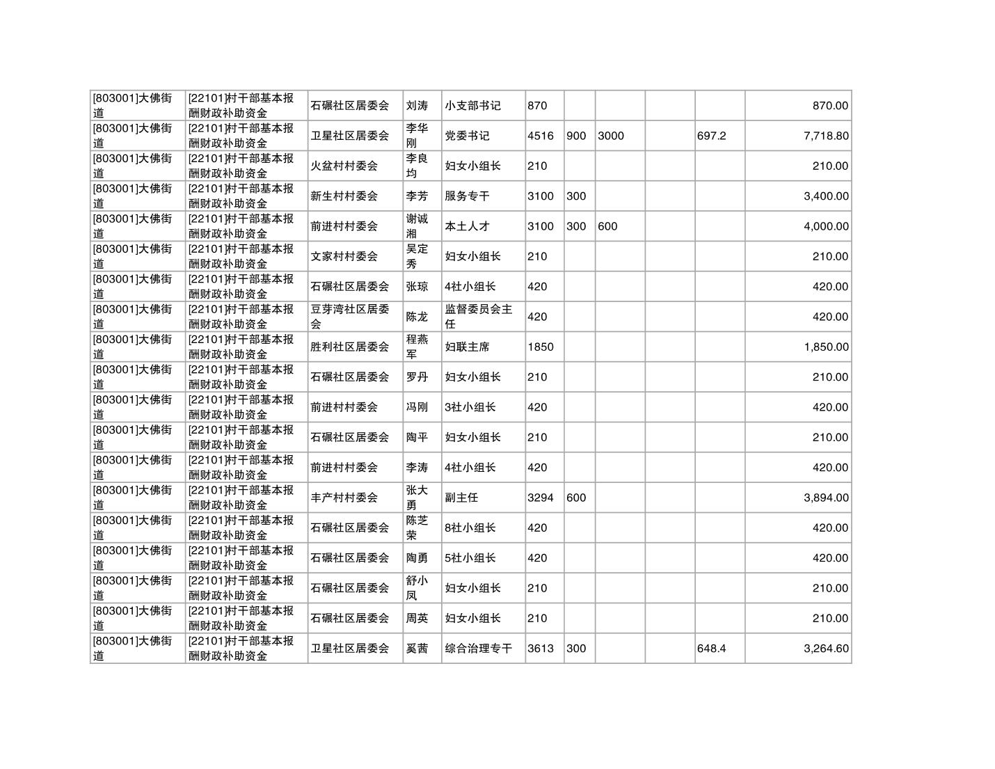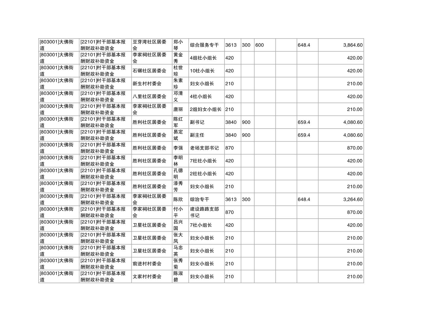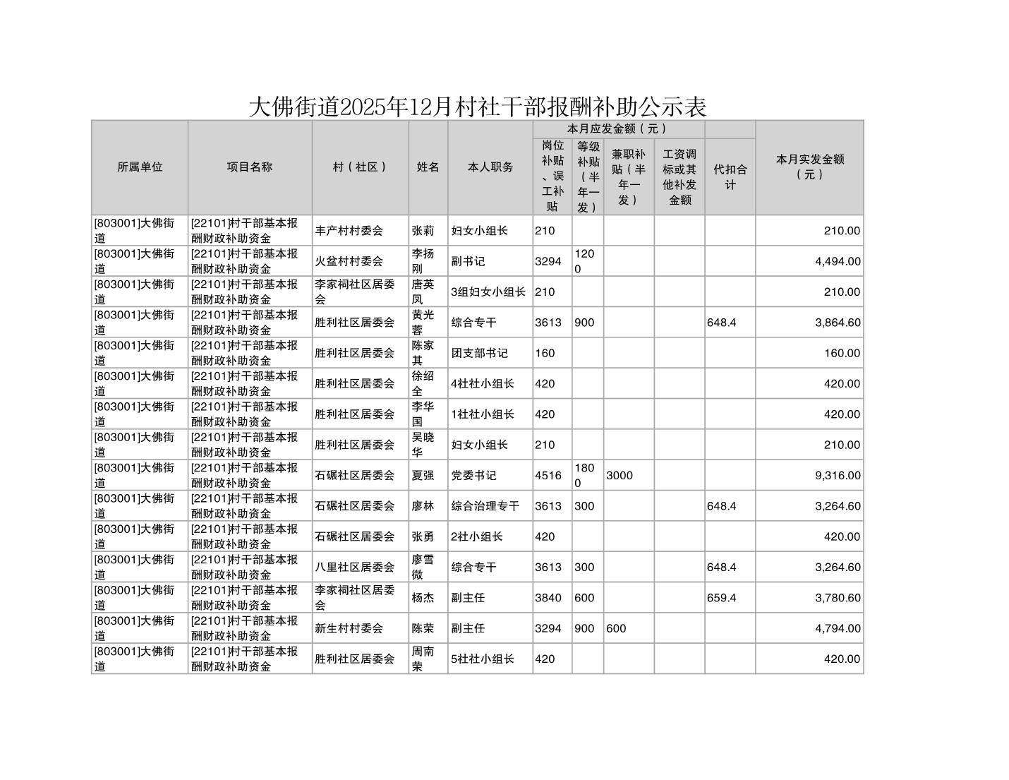 重庆市潼南区大佛街道2025年12月村社干部报酬补助公示表