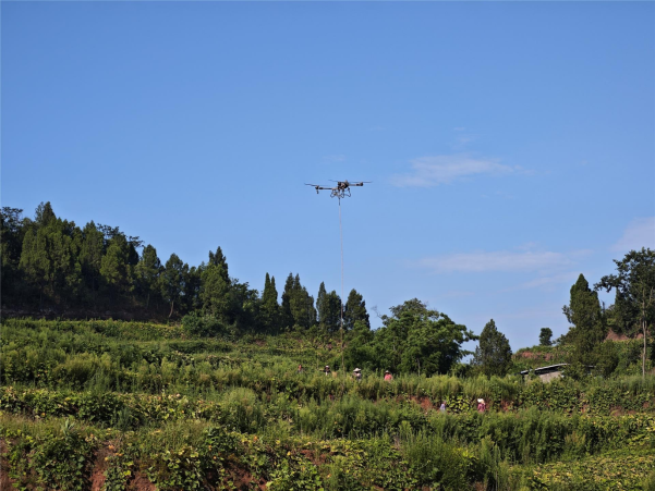 眼下正是南瓜的丰收时节,在米心镇夏家社区南瓜种植基地里,一垄垄南瓜藤蔓顺着田垄铺展,绿油油的叶片层层叠叠。村民们熟练地穿梭在“绿海”之中,俯身将藏在叶子下的南瓜摘下,一旁的无人机稳稳地将南瓜吊起,沿着预定的路线飞向运输车旁。