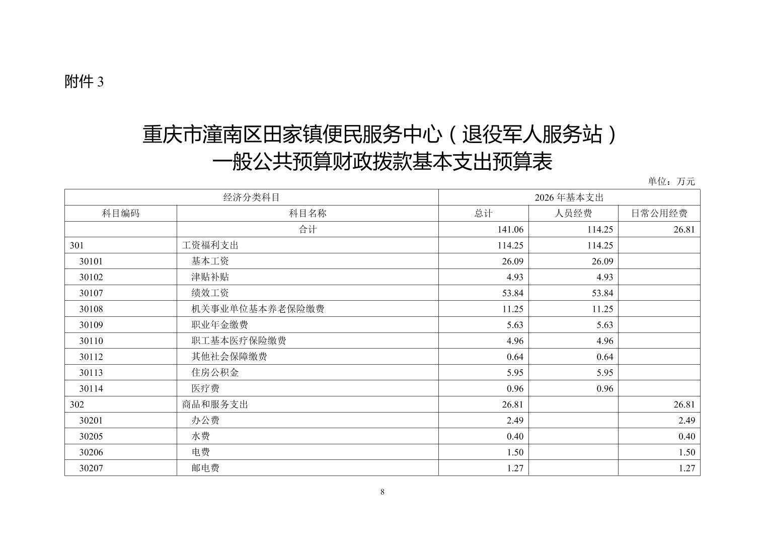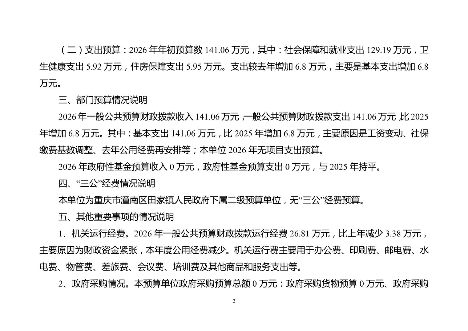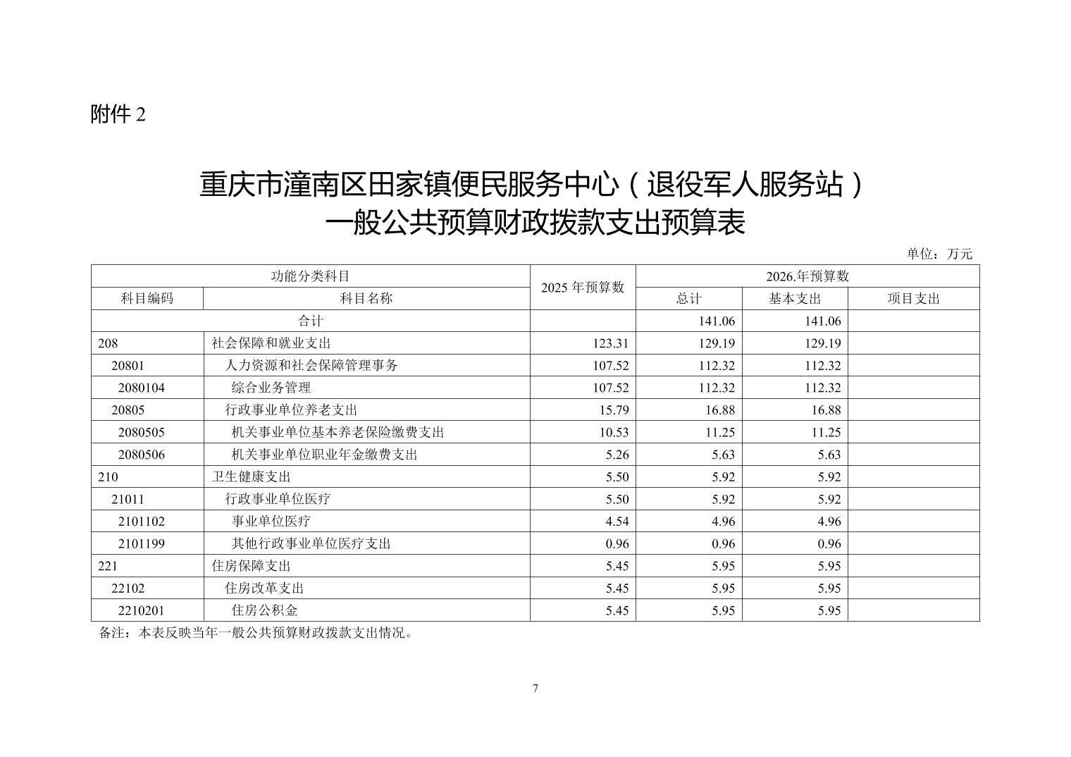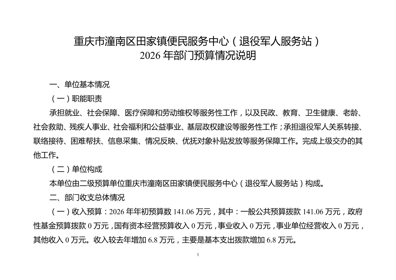 重庆市潼南区田家镇便民服务中心(退役军人服务站)2026年部门预算情况说明