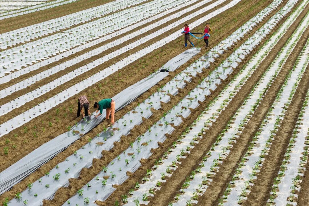 ▲3月9日,潼南区桂林蔬菜基地,农民们在为蔬菜苗铺地膜(无人机照片)。记者 张春晓 实习生 李子英 摄