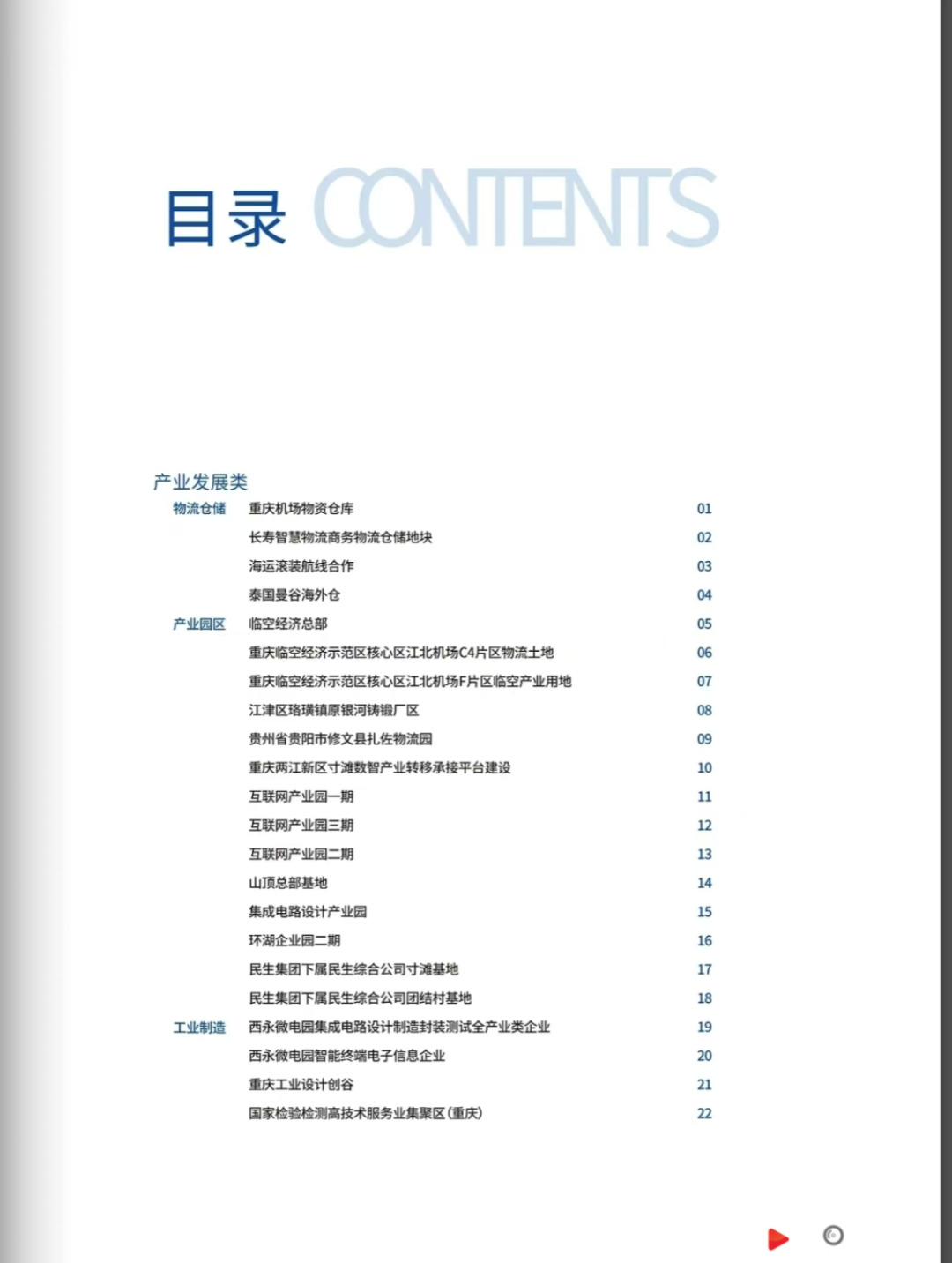 产业发展类项目43个,总投资85亿元,涵盖物流仓储、产业园区、工业制造等领域 如民生集团拟联合汽车整机主机厂、汽车贸易商,打造海运滚装精品航线,助力“渝车出海”,同步联合相关企业运营泰国曼谷海外仓,拓展对外合作渠道;保税港集团寸滩数智产业转移承接平台建设项目拟引入现代服务产业,打造高端总部办公园区,推动产业转型升级;西永产投集团重庆工业设计创谷拟重点引进工业设计类企业,聚力打造具有全国影响力的“工业设计社区”,激活产业创新活力。