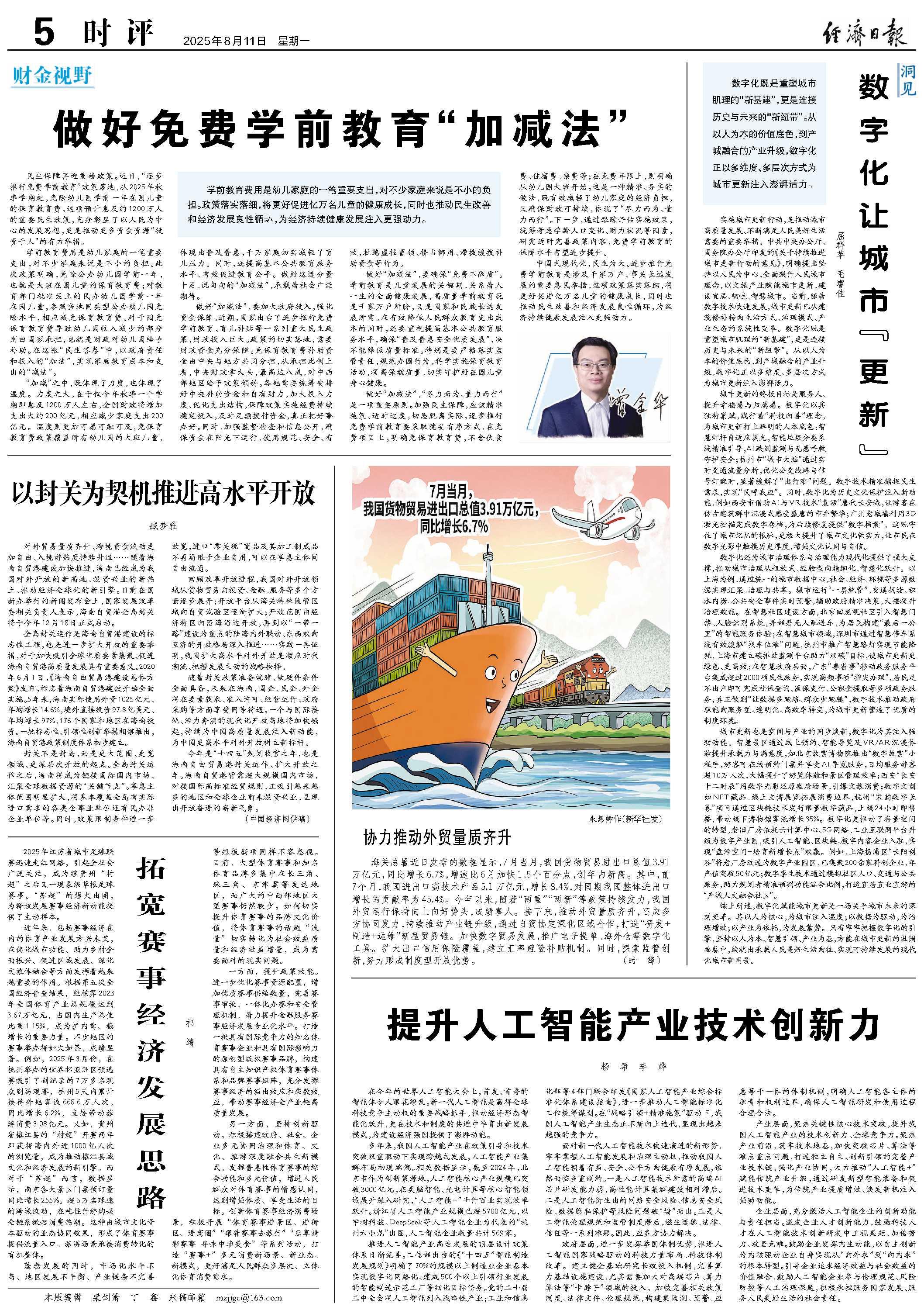“加减”之中,既体现了力度,也体现了温度。力度之大,在于仅今年秋季一个学期即惠及1200万人左右,全国财政将增加支出大约200亿元,相应减少家庭支出200亿元。温度则更加可感可触可及,免保育教育费政策覆盖所有幼儿园的大班儿童,体现出普及普惠,千万家庭切实减轻了育儿压力。同时,还提高基本公共教育服务水平、有效促进教育公平。做好这道分量十足、沉甸甸的“加减法”,承载着社会广泛期待。
