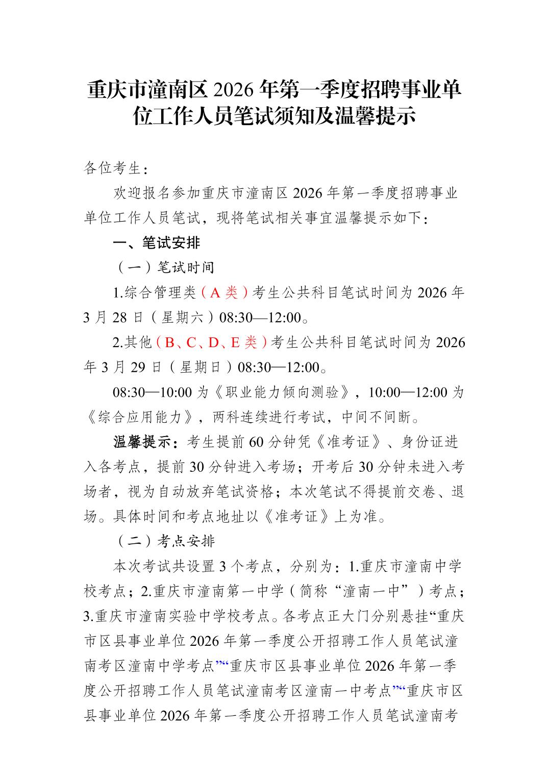 重庆市潼南区2026年第一季度招聘事业单位工作人员笔试须知及温馨提示