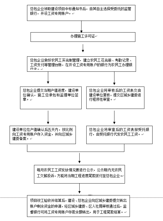 第十五条 农民工工资由受托银行根据在区城乡建委备案的农民工工资表进行发放。总包企业每月15日前将工资表报至区城乡建委备案,受托银行凭加盖区城乡建委印章的工资表及区城乡建委监章的支票代付农民工工资。